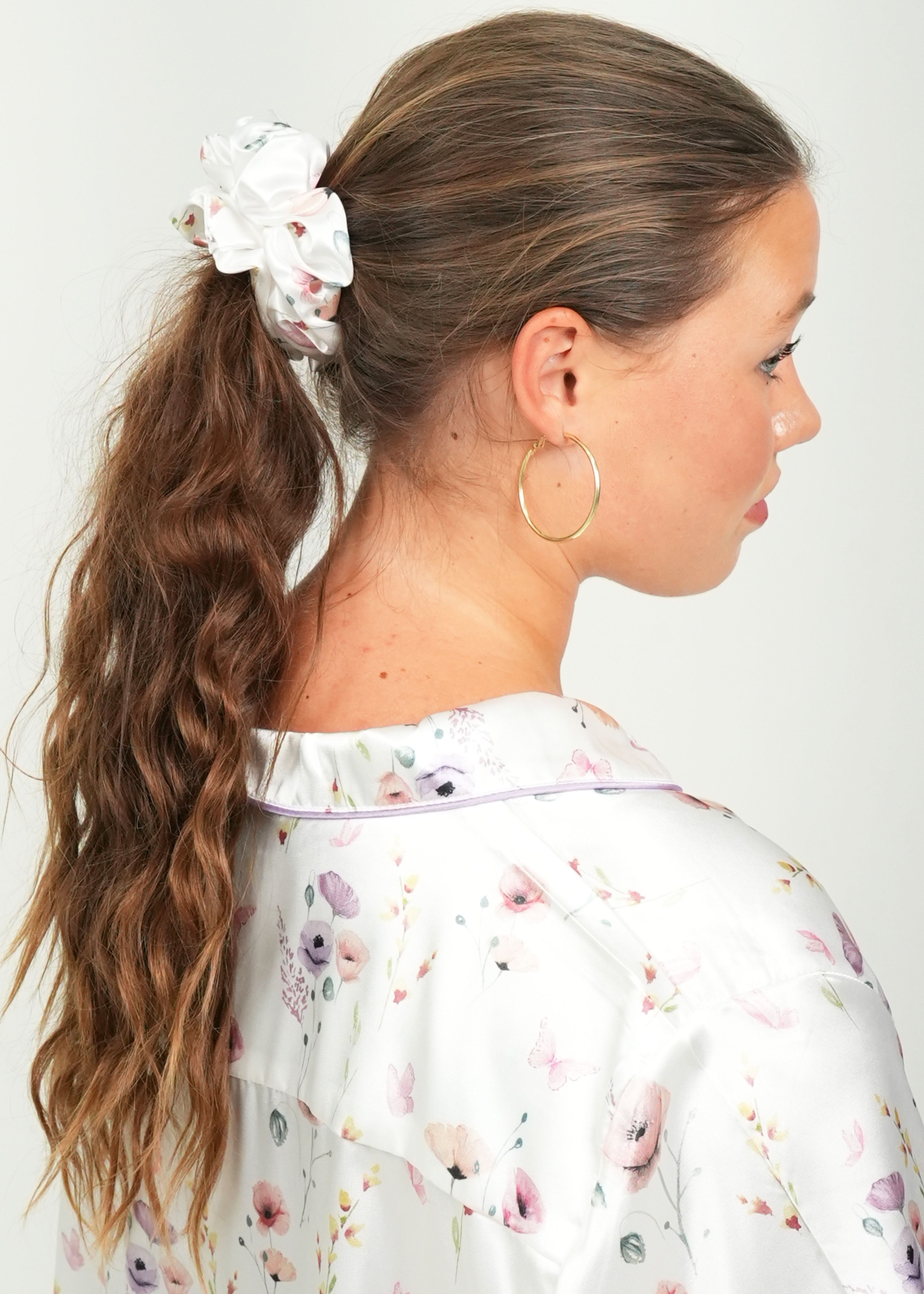 Add a playful touch to your bedtime routine with our stunning Edge of the Meadow Satin Hair Scrunchie, featuring a unique design to match your favorite set of Night Sweet Thing pajamas! Made from soft, hair-friendly satin, it securely holds your hair whilst adding a pop of color and fun! Treat yourself or gift it to a friend - sweet dreams await!