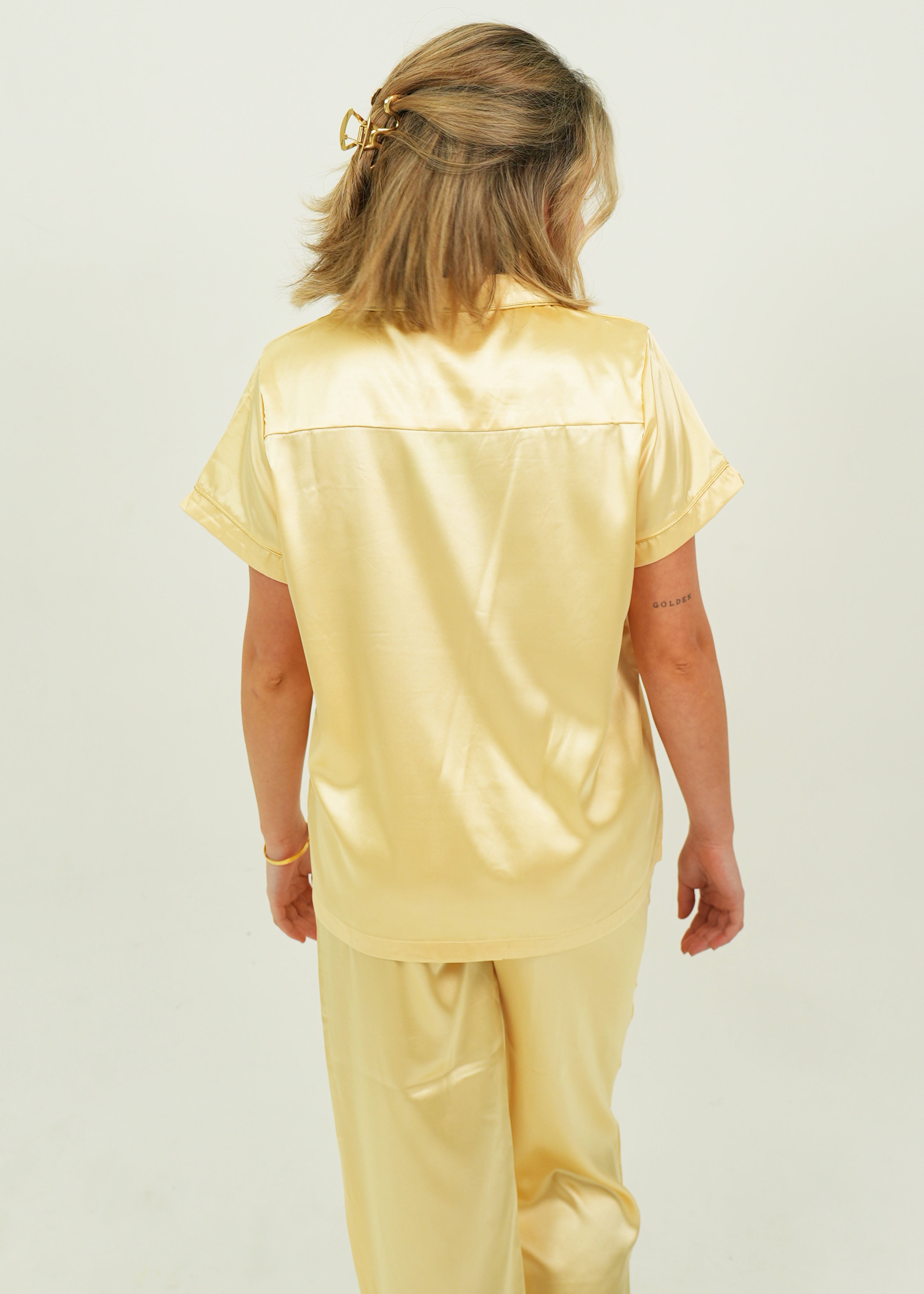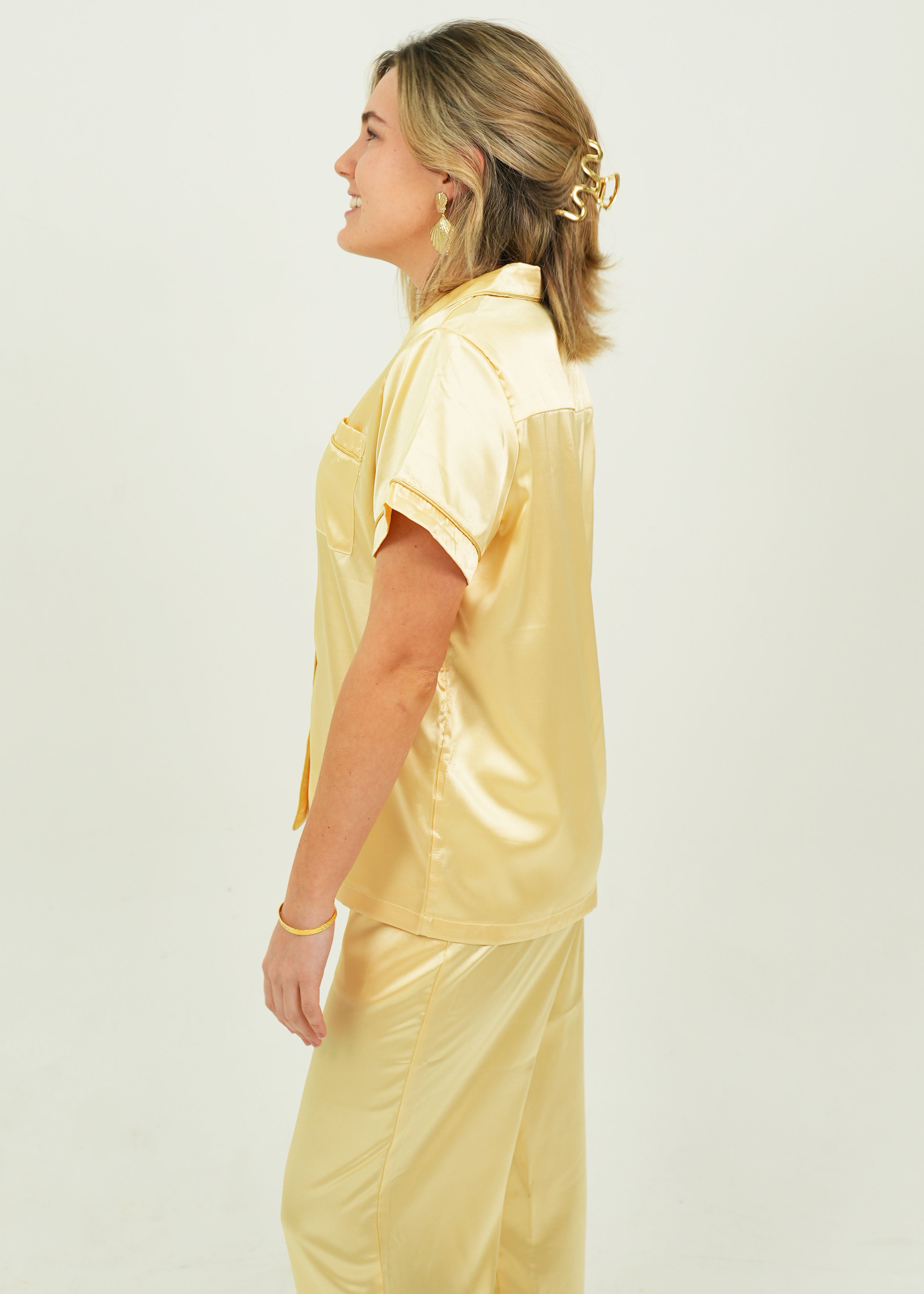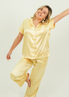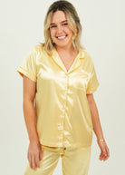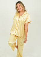 Indulge yourself in our luxuriously silky and oh so buttery soft Gold Satin Pajamas. Lovingly detailed with deep pockets, adorable buttons, and an extra stretchy drawstring waistband for the ultimate comfort experience.