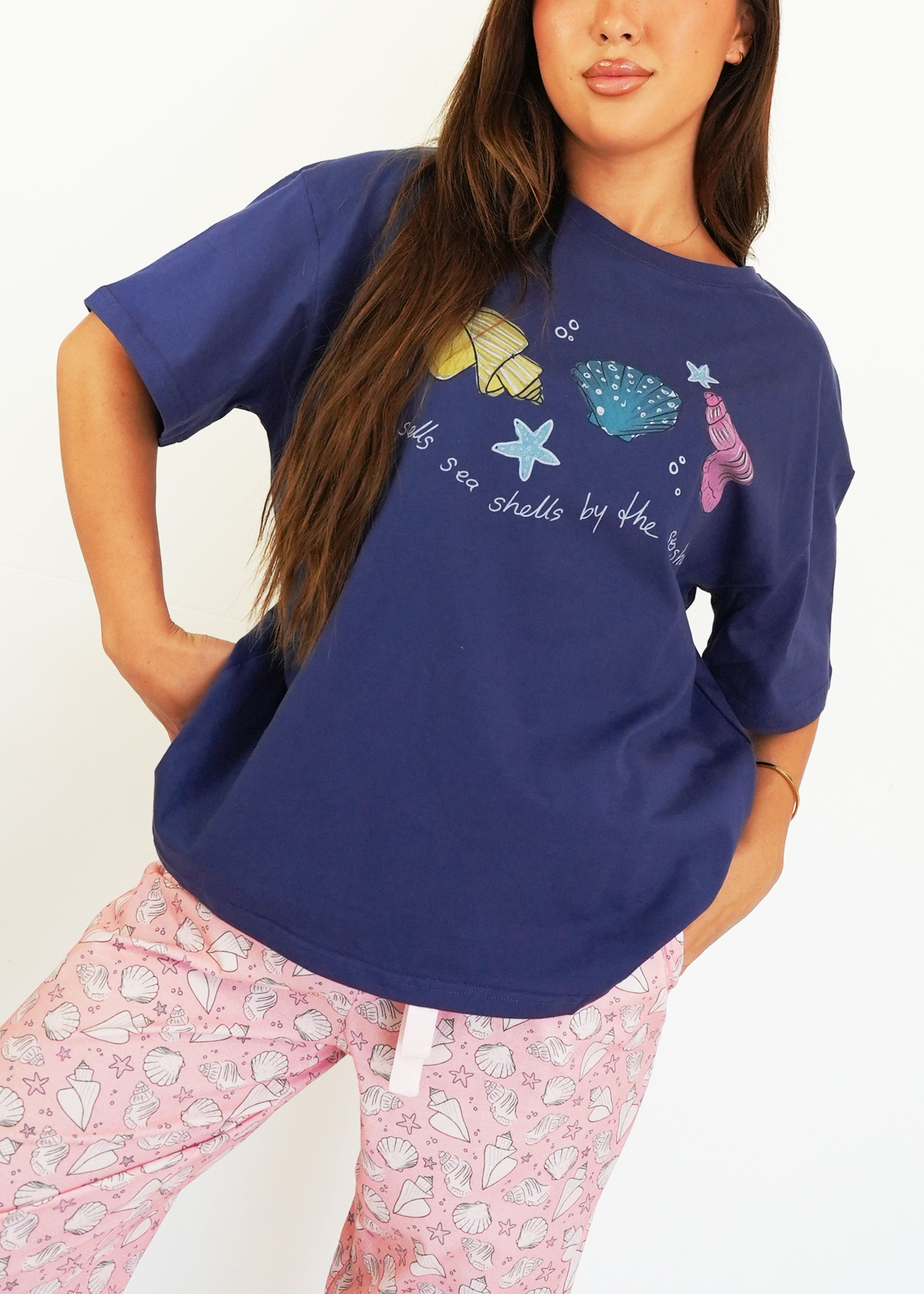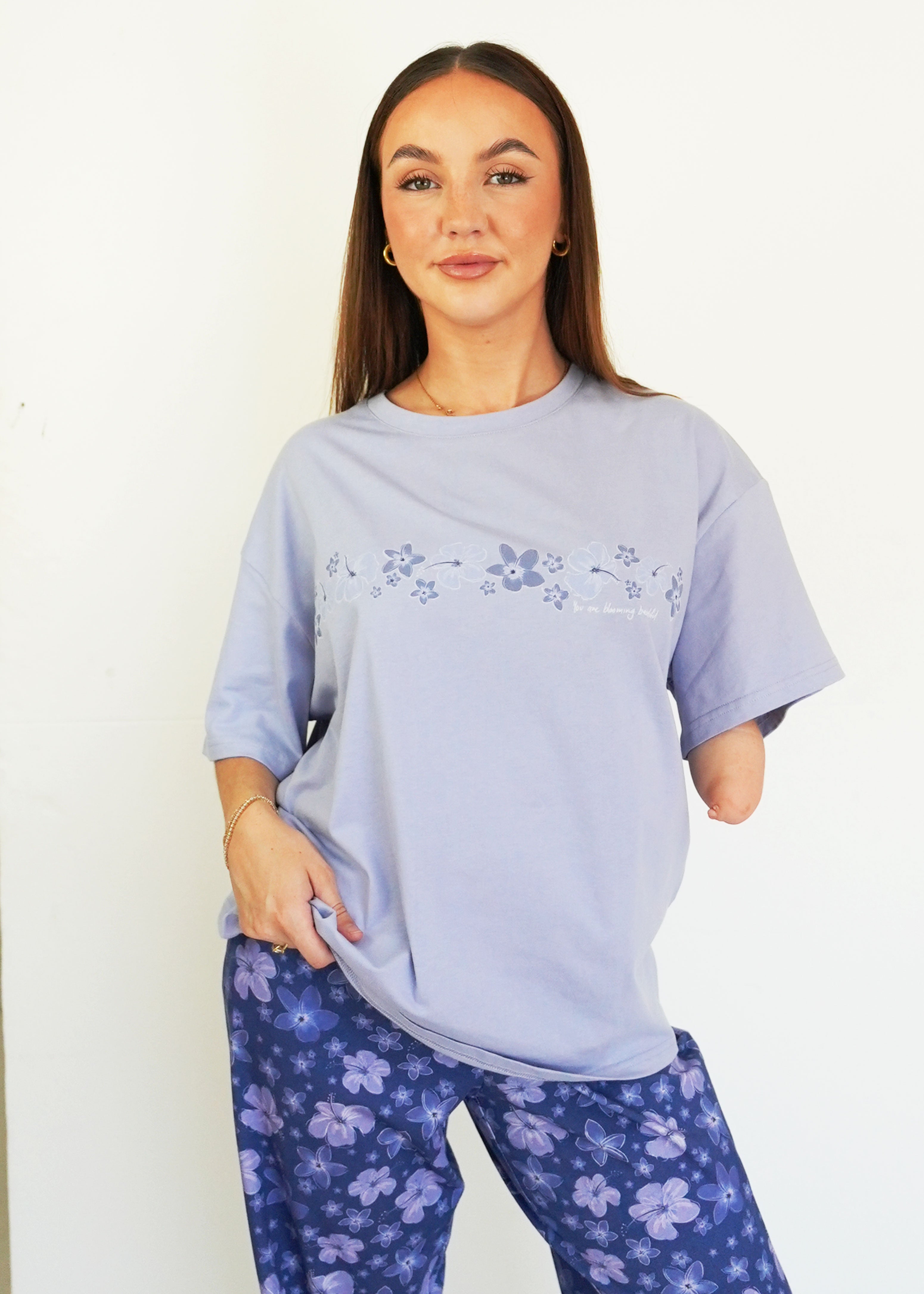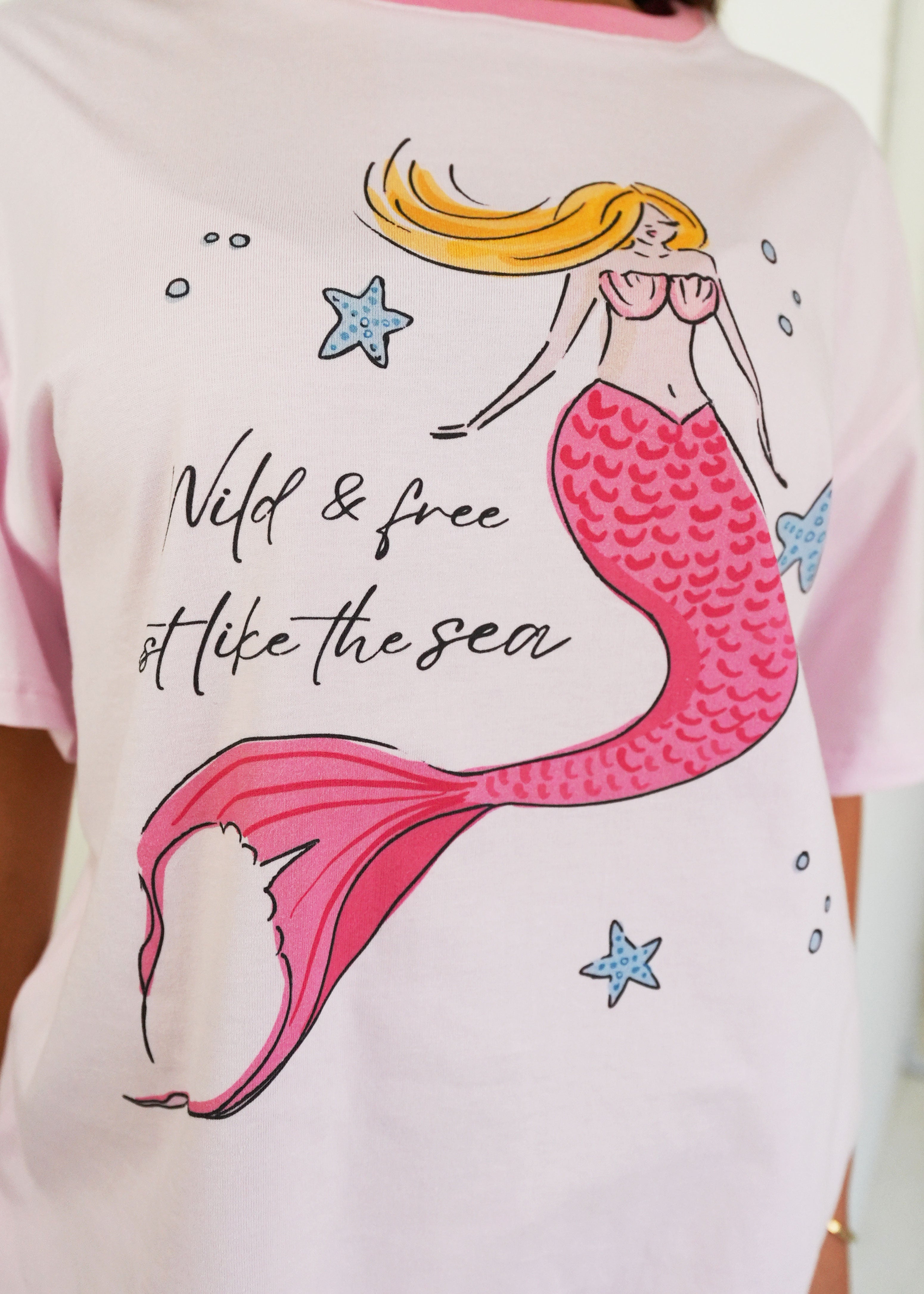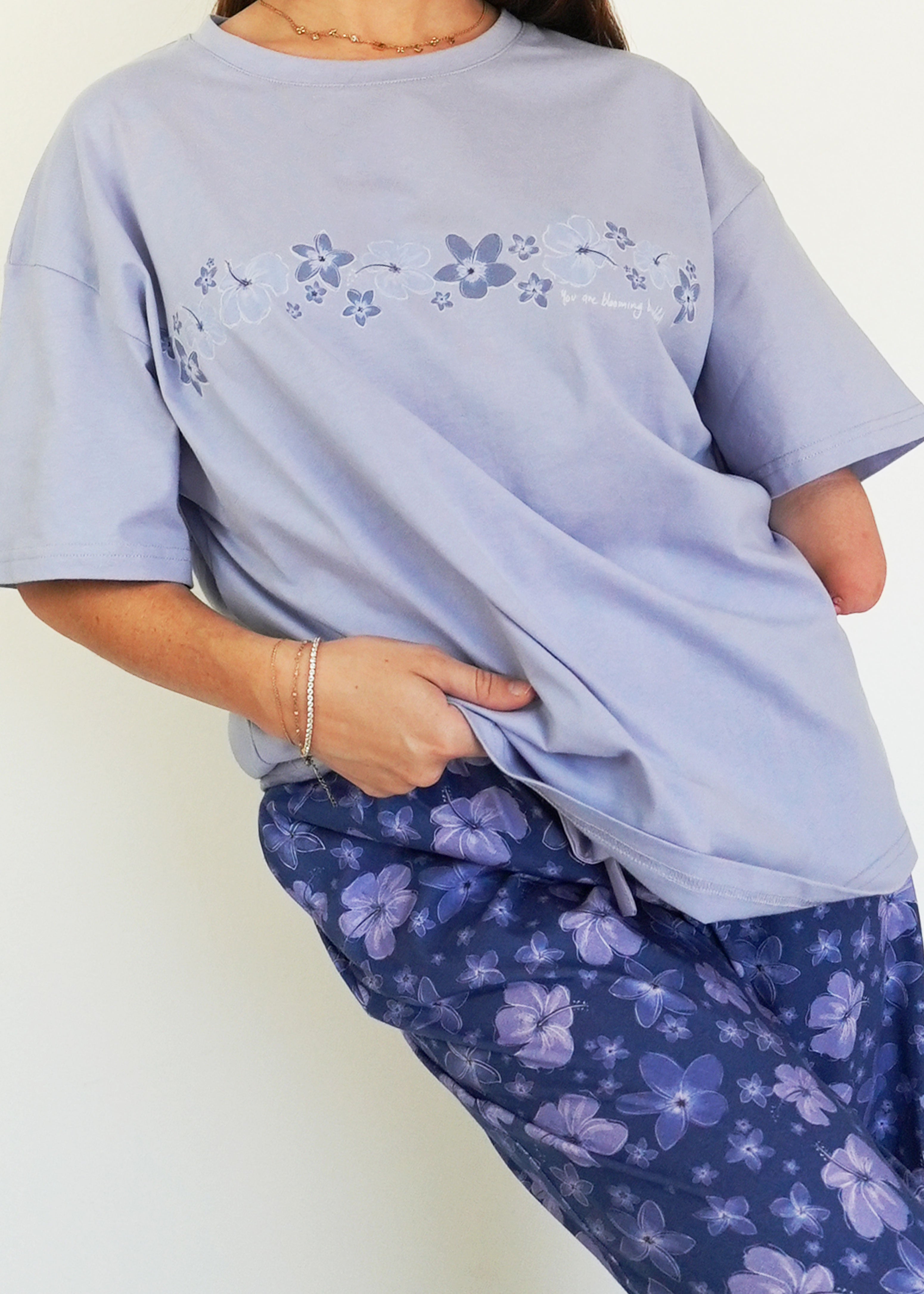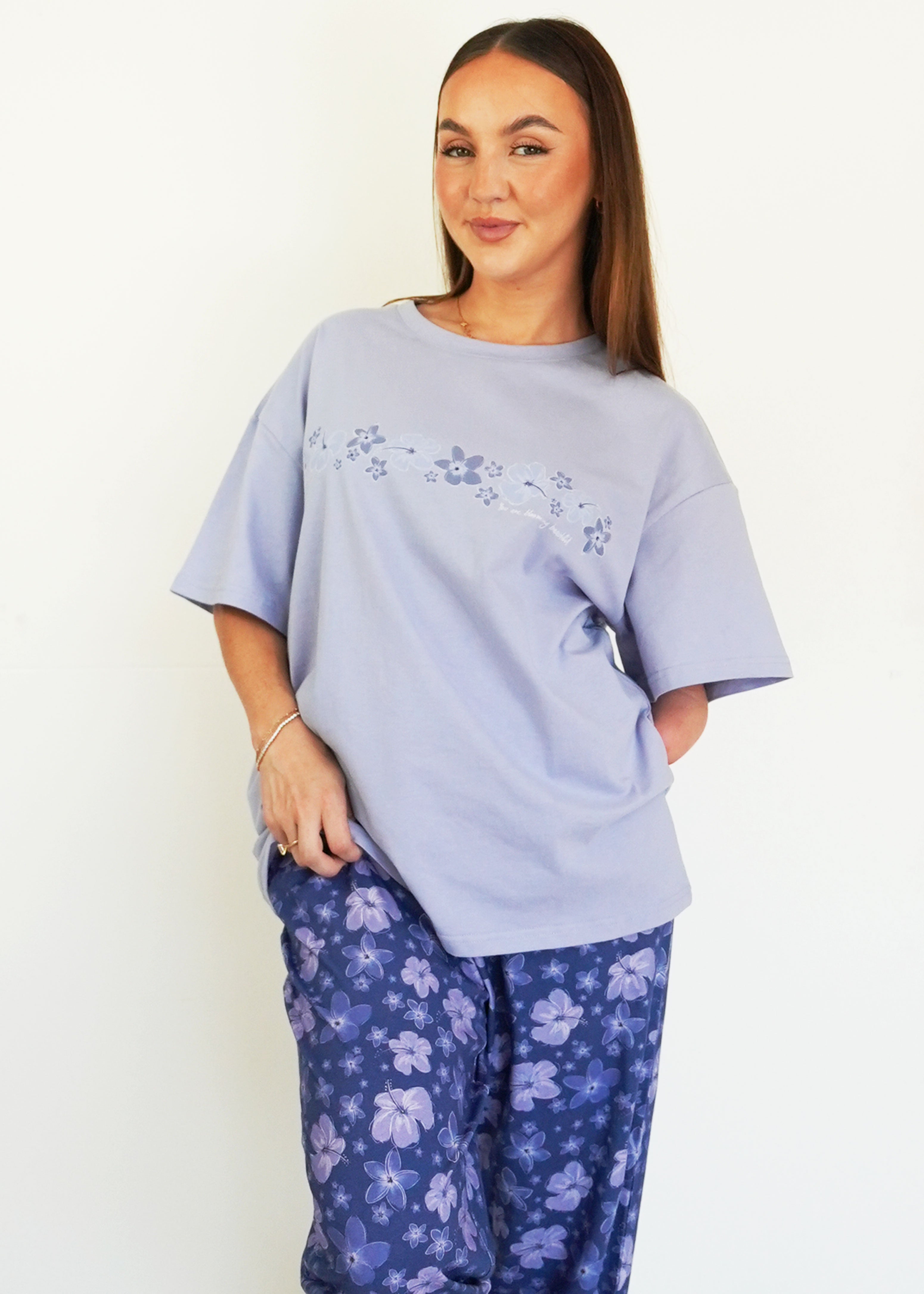 First of all, I love the material it is 100% cotton. The fit is perfect! A little over size but perfect for sleeping. The design is very cute! I hope you guys make more cotton products 🙏😙 thank you!