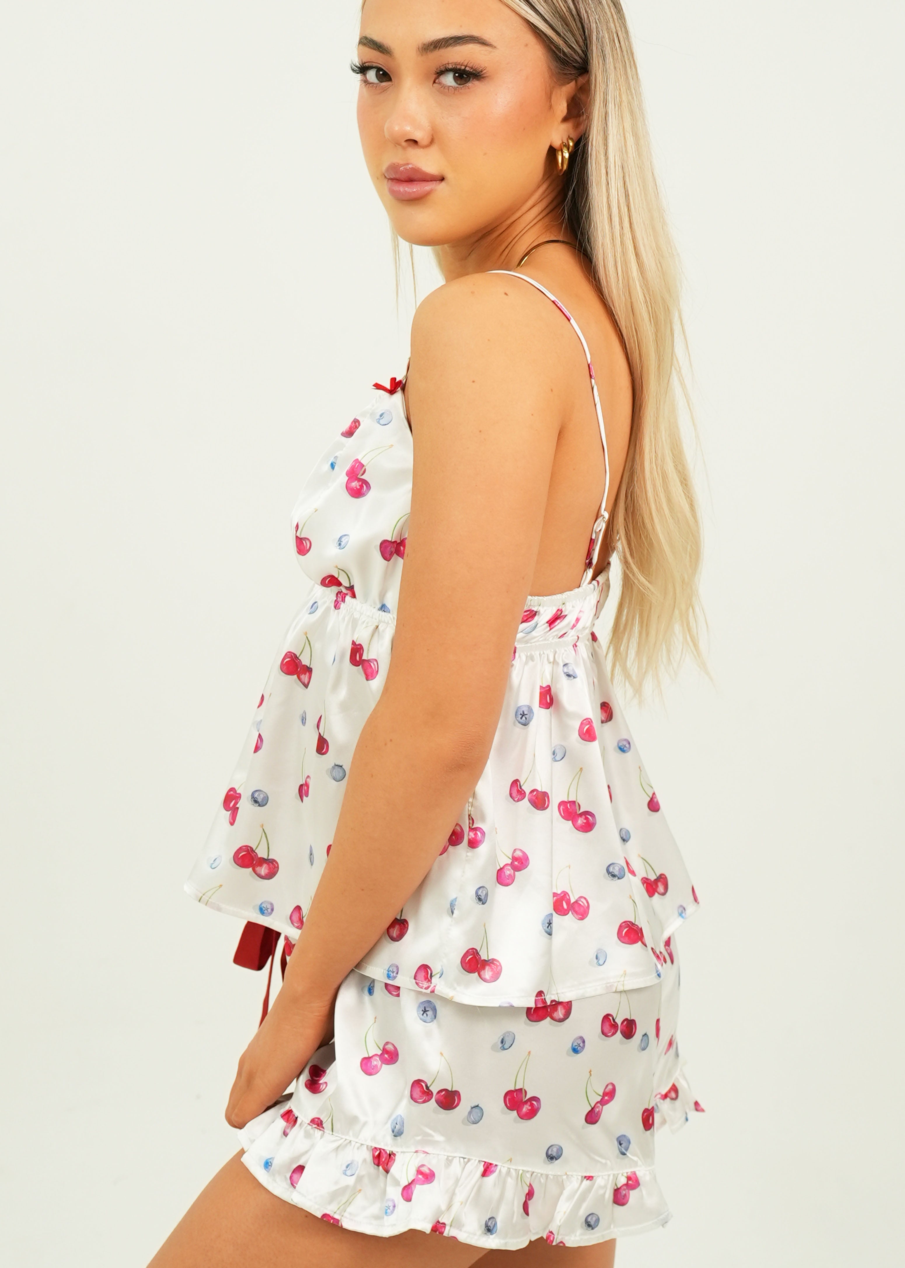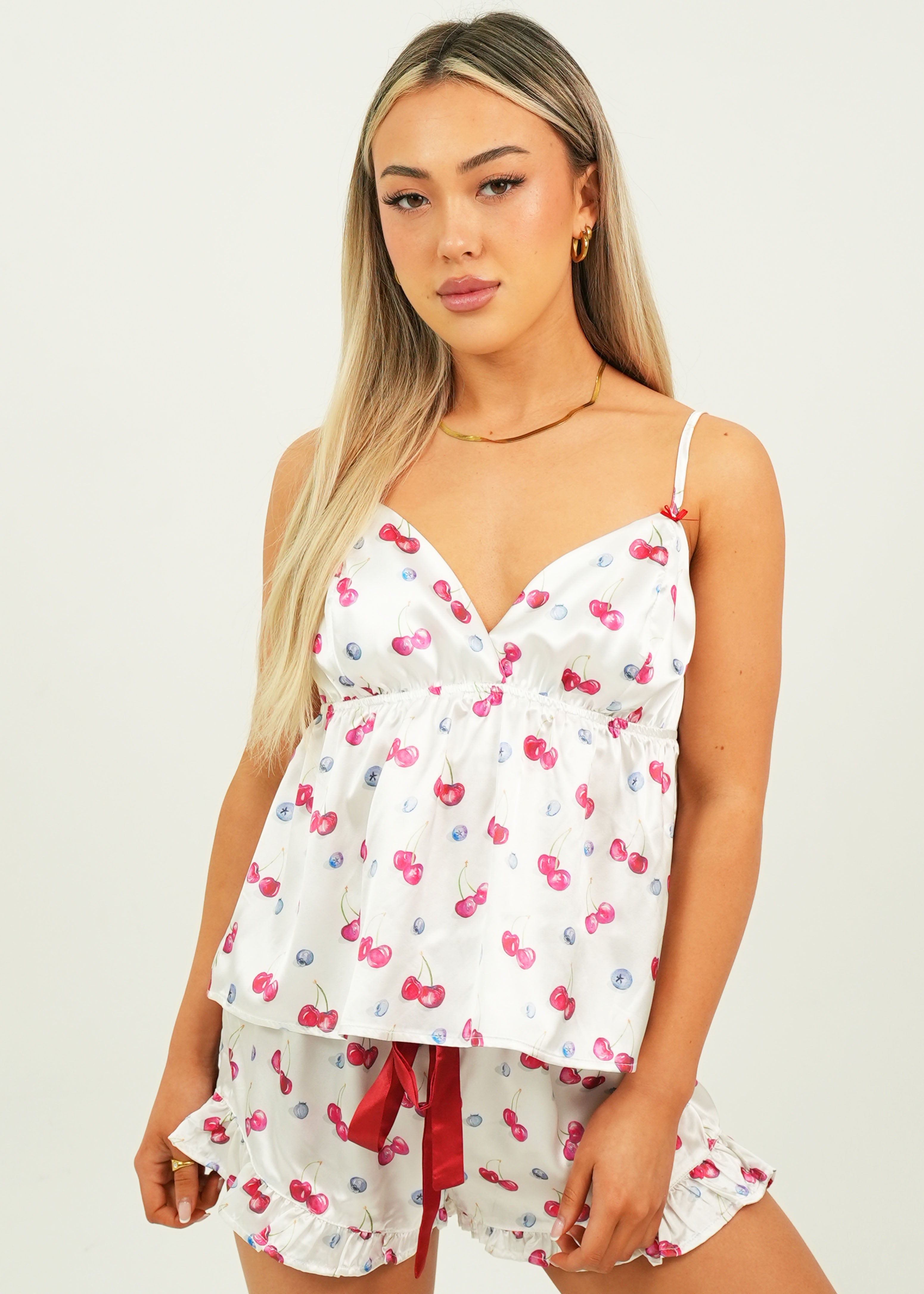Add a touch of berry goodness to your bedtime with our gorgeous Satin Camisole Pajamas. Fashioned with the cutest frill detailed shorts, adjustable straps and flattering neckline, you are sure to have the sweetest sleep!