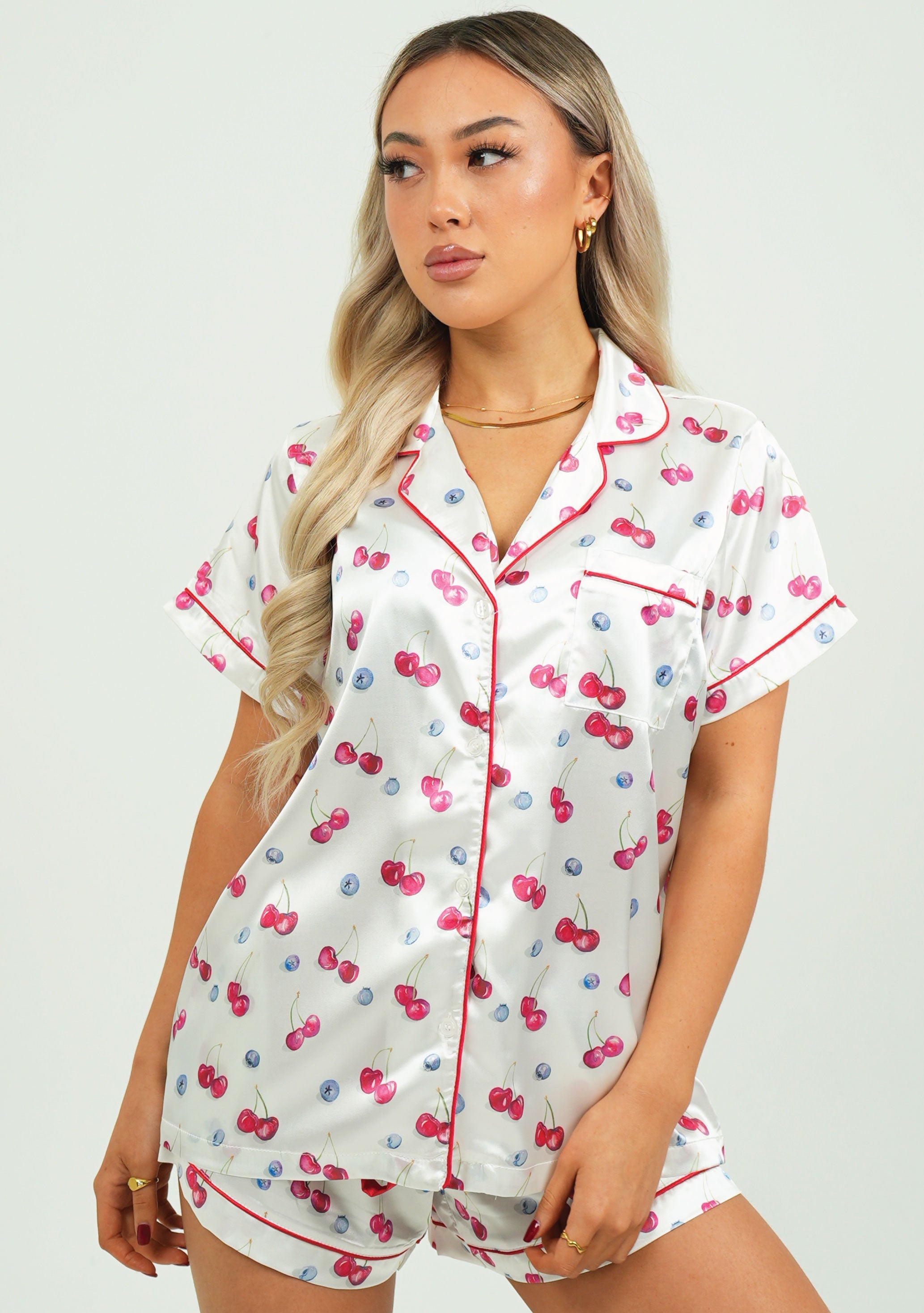 Add a touch of fruity goodness to your bedtime with our gorgeous Cherries and Berries Satin Pajamas. Beautifully detailed with deep pockets, adorable buttons, and an extra stretchy drawstring waistband, you are sure to have the sweetest sleep!