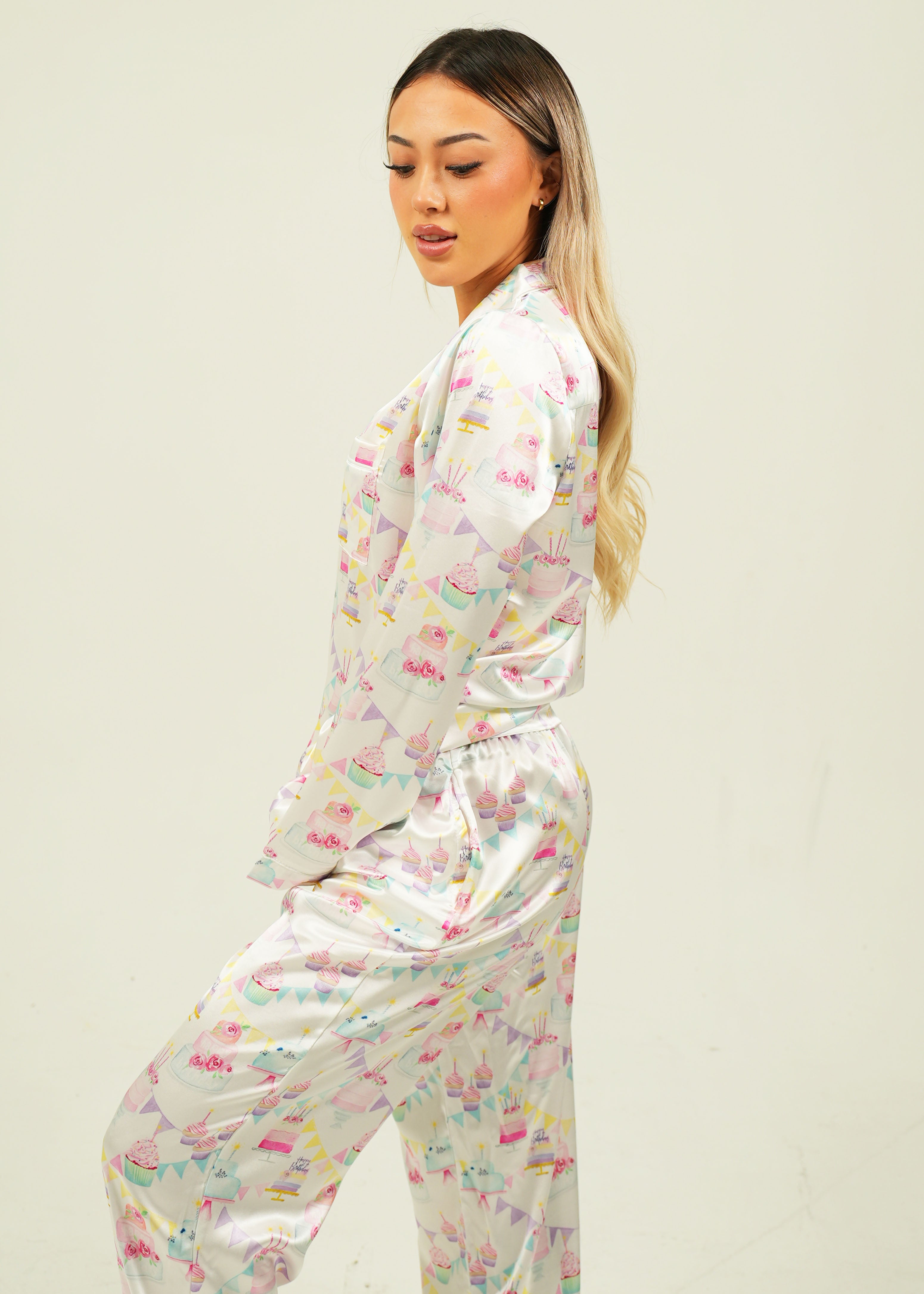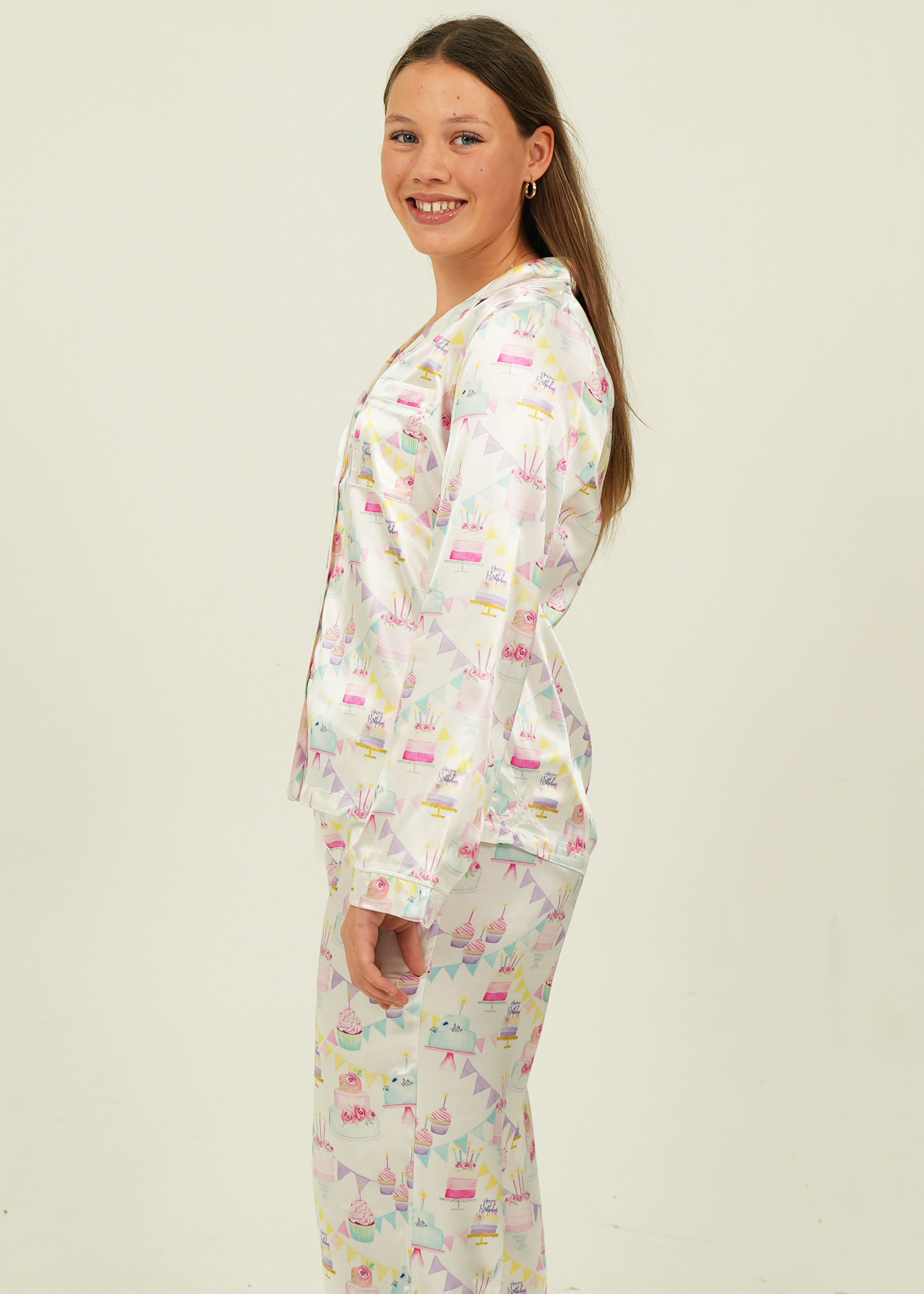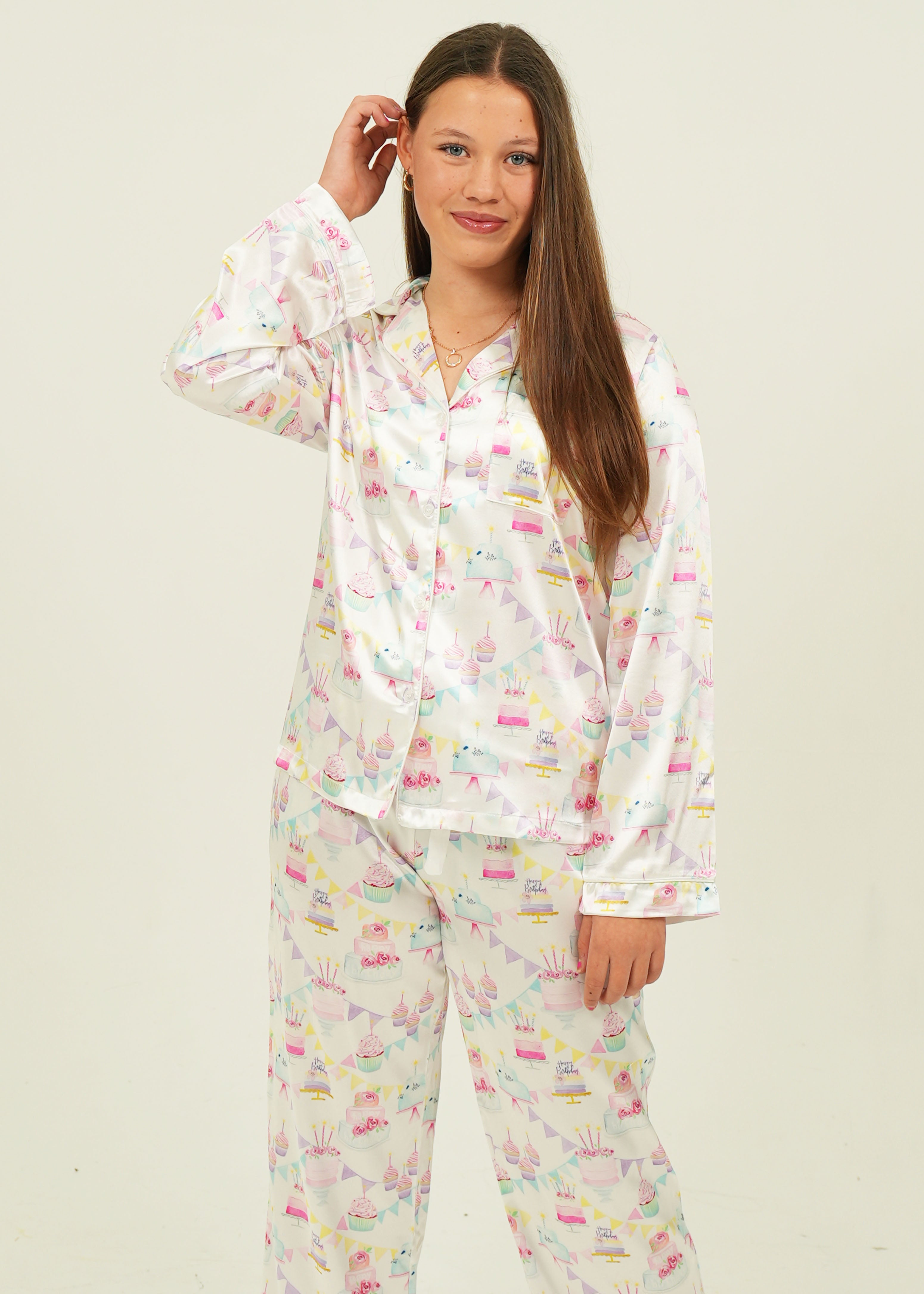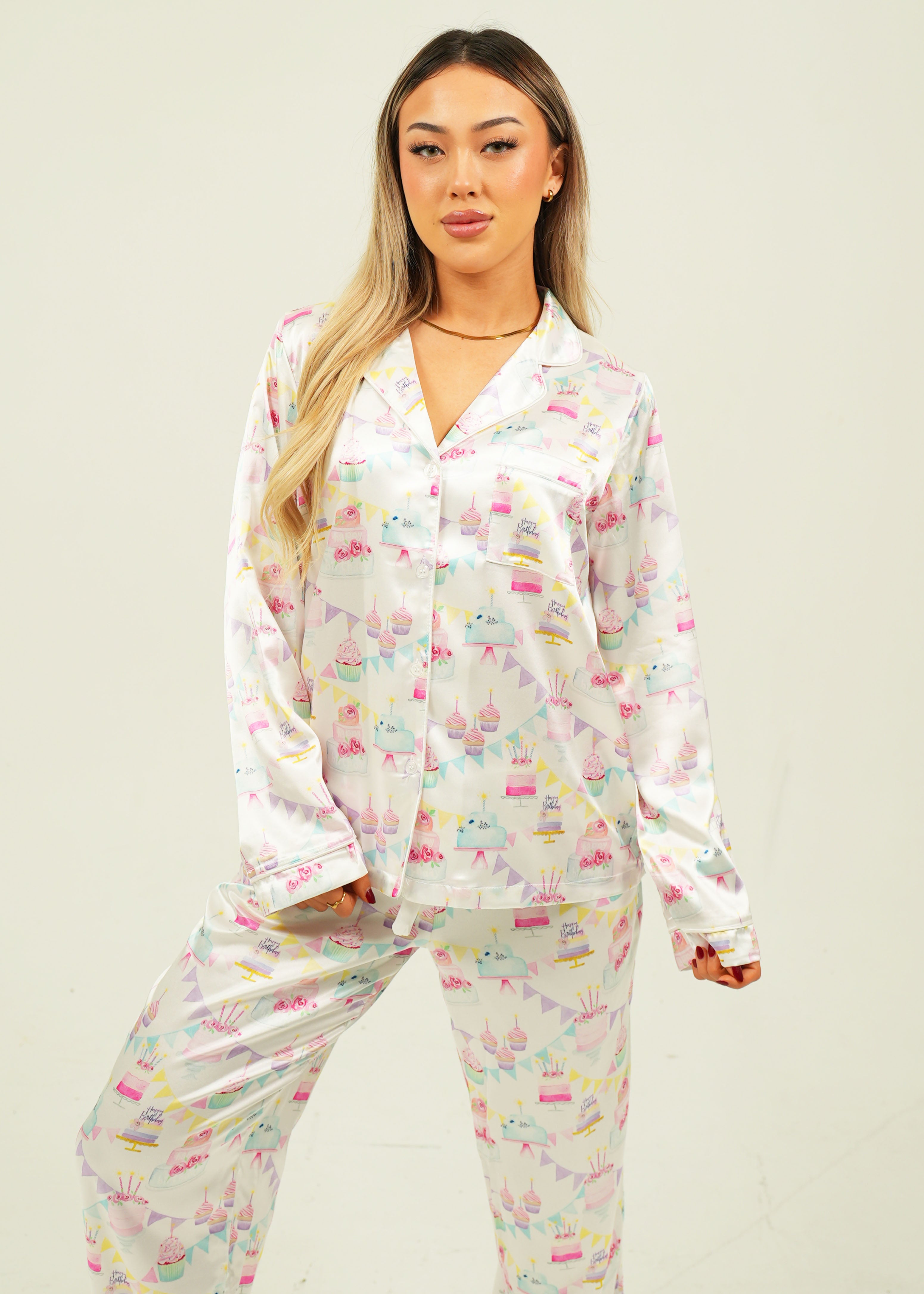 Celebrate in style with our festive Satin Birthday Pajamas. Whether on your special day or just for fun, our Birthday set will make every moment a little brighter. Lovingly detailed with deep pockets, adorable buttons, and an extra stretchy drawstring waistband for the ultimate comfort experience.