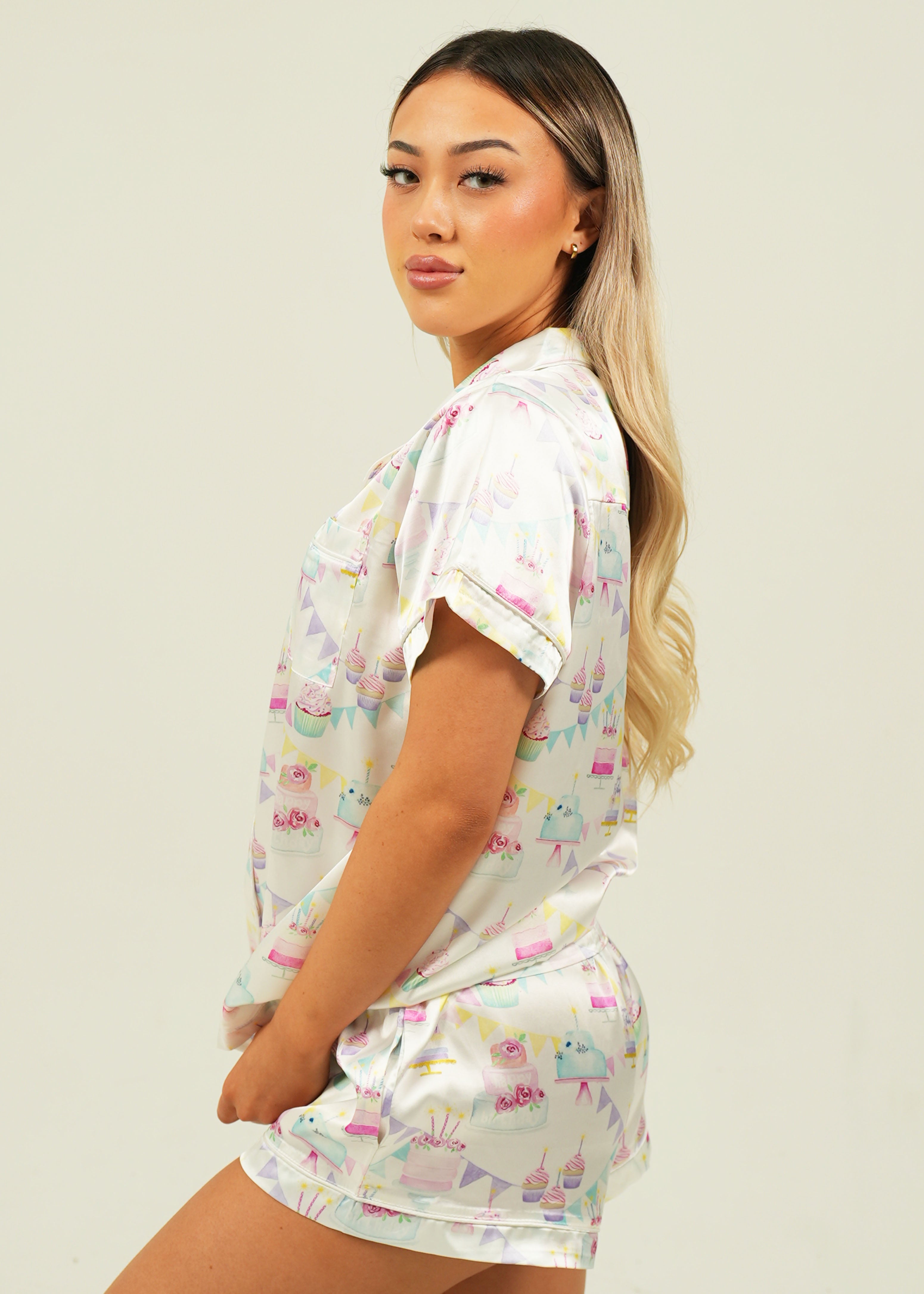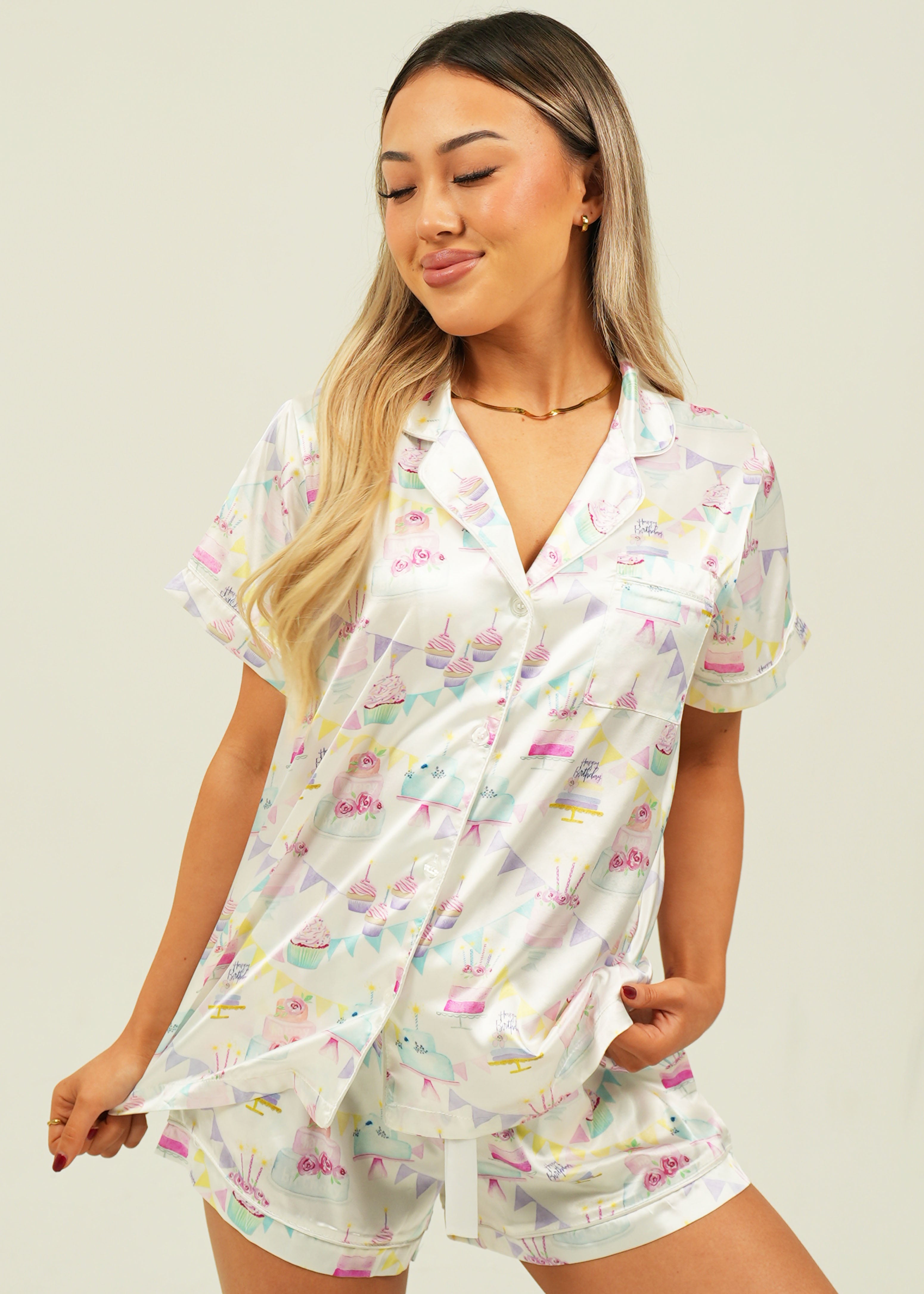 Celebrate in style with our festive Satin Birthday Pajamas. Whether on your special day or just for fun, our Birthday set will make every moment a little brighter. Lovingly detailed with deep pockets, adorable buttons, and an extra stretchy drawstring waistband for the ultimate comfort experience.