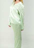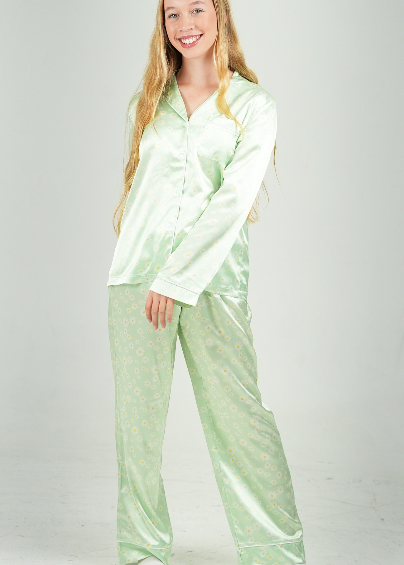 Frolic through the fields of endless daisies in our Green Daisy Long Top / Long Pants Satin Pajamas. With deep pockets, adorable buttons, and an extra stretchy waistband for the ultimate comfort experience, you are sure to have the most luxurious sleep.