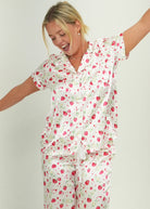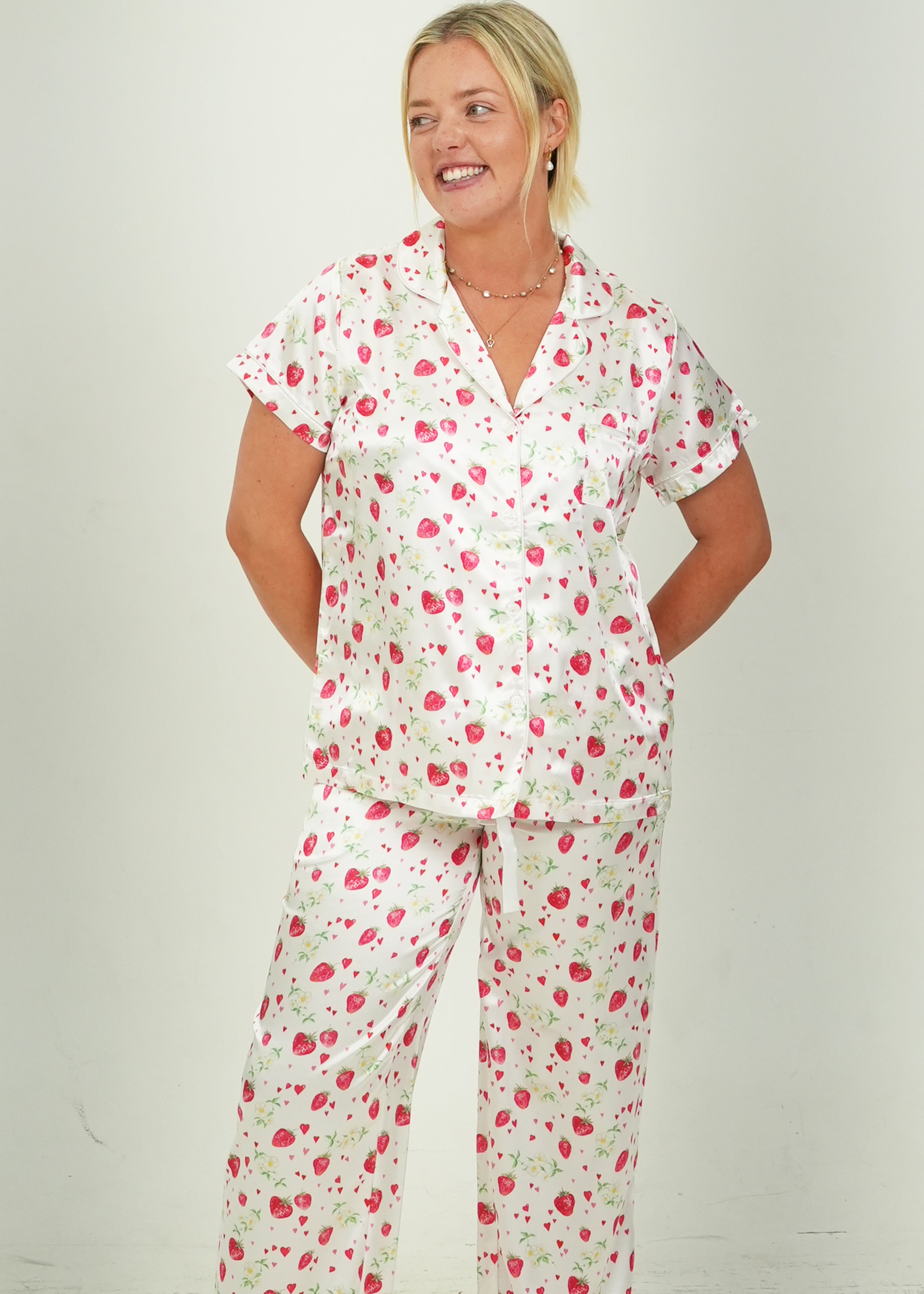 Add a touch of fruity goodness to your bedtime with our gorgeous Strawberries Satin Pajamas. Beautifully detailed with deep pockets, adorable buttons, and an extra stretchy drawstring waistband, you are sure to have a peachy keen sleep!