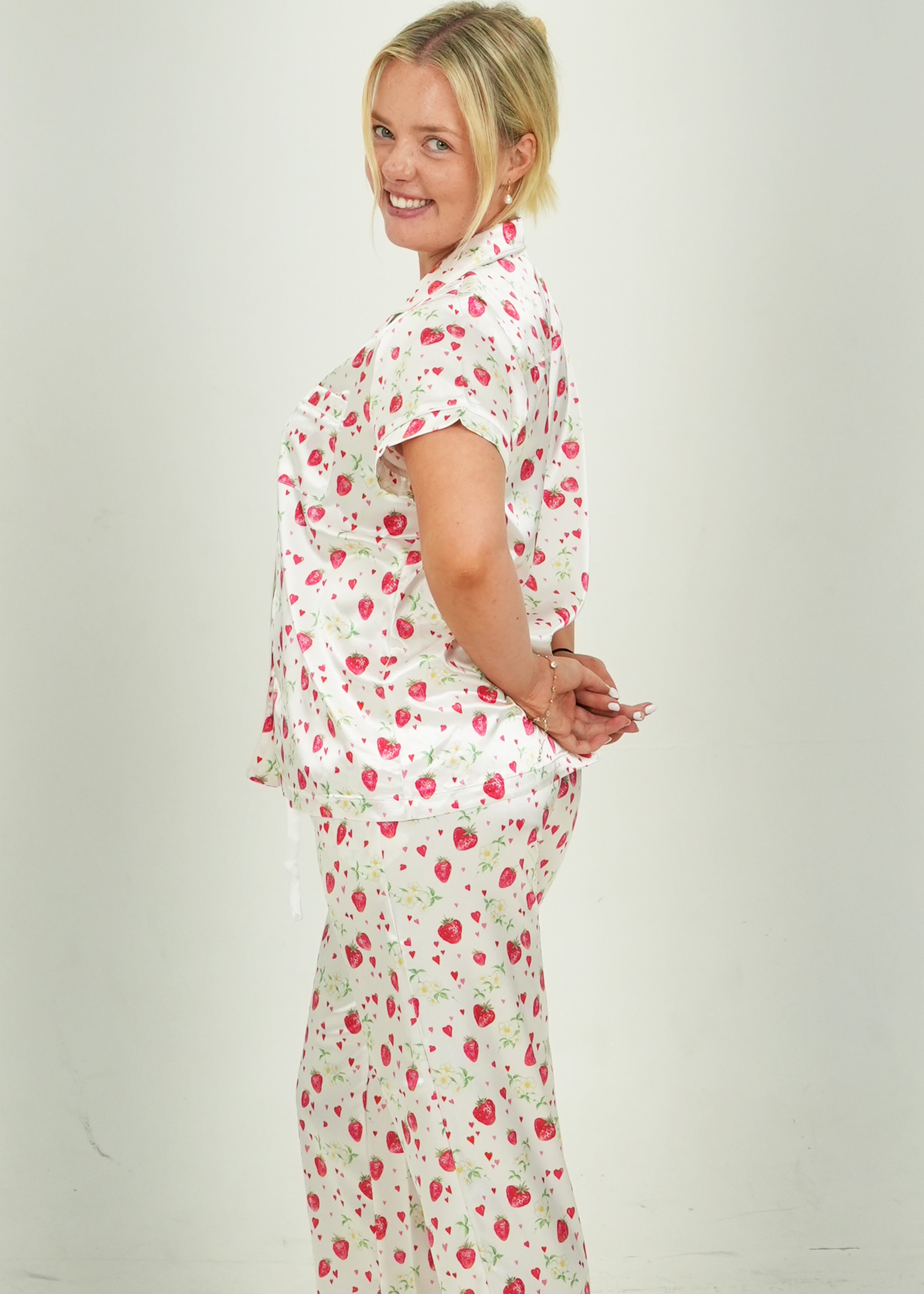 Girls - Strawberries Short Top / Long Pants Satin PJ Set