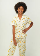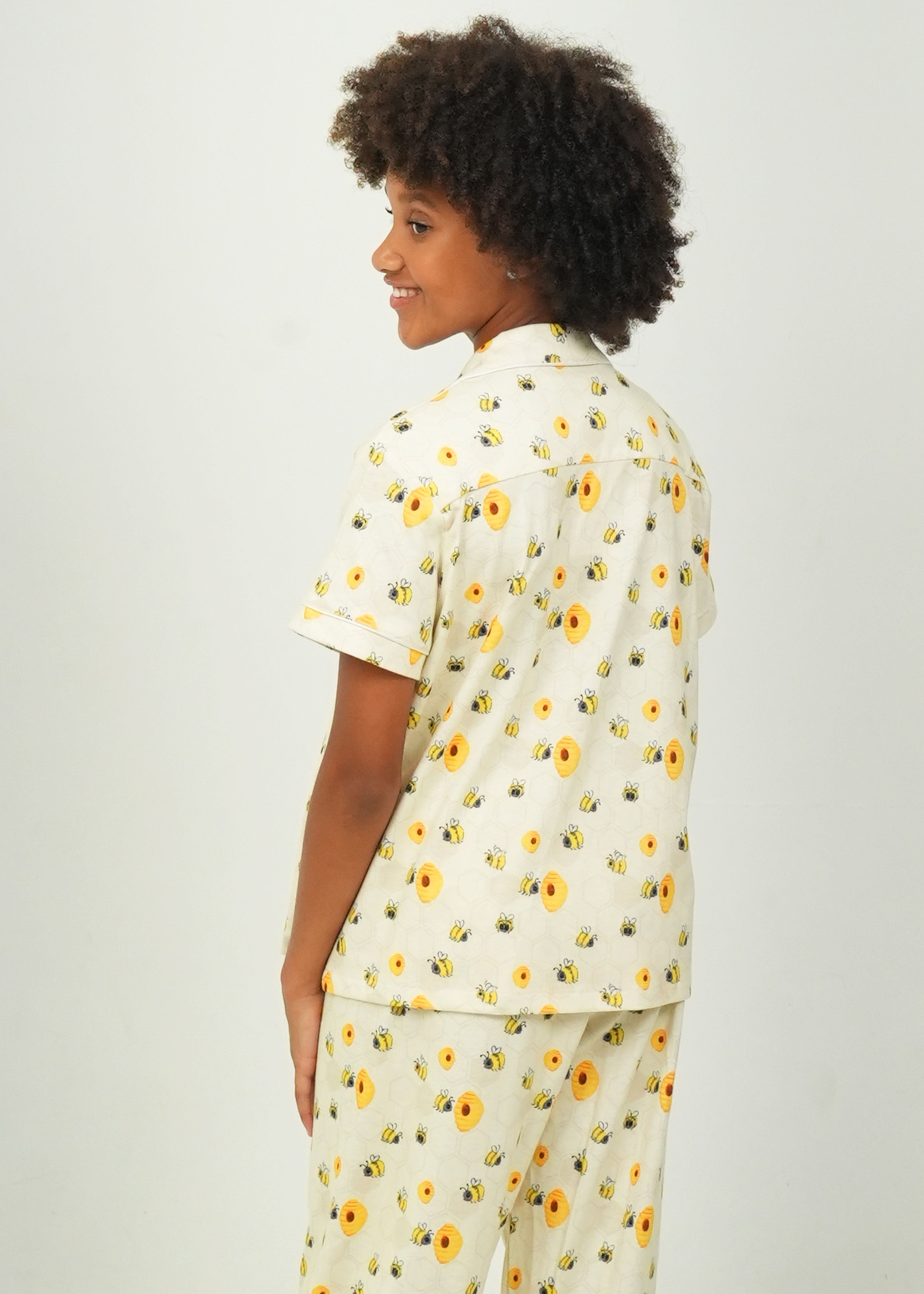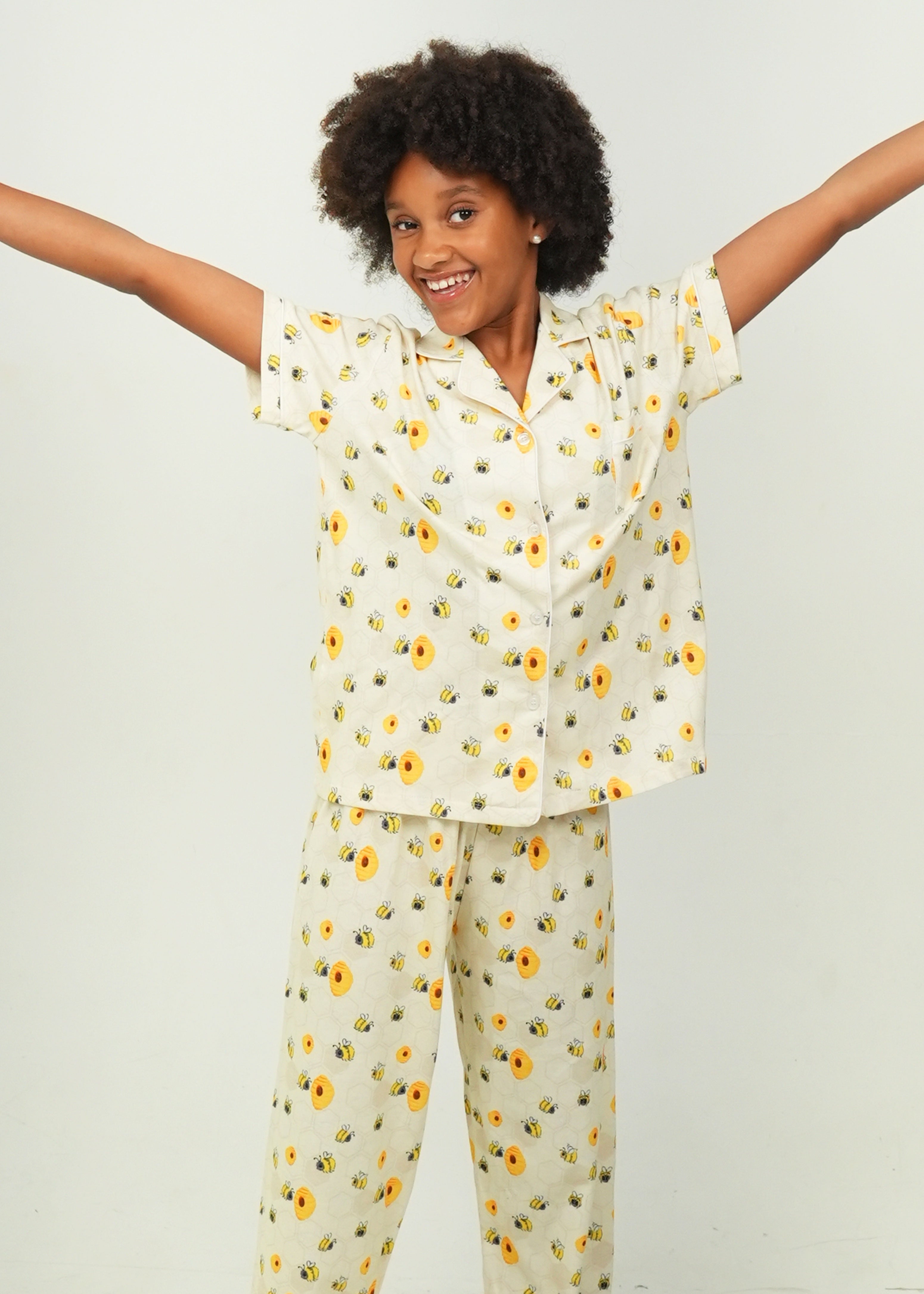 Every detail has been lovingly considered for your ultimate comfort Yellow Bumble Bees Pj set - from the relaxed soft cotton fabric, deep pockets & cute little buttons. Extra stretchy waistband can be worn high. Short Top, Long Pants Set.