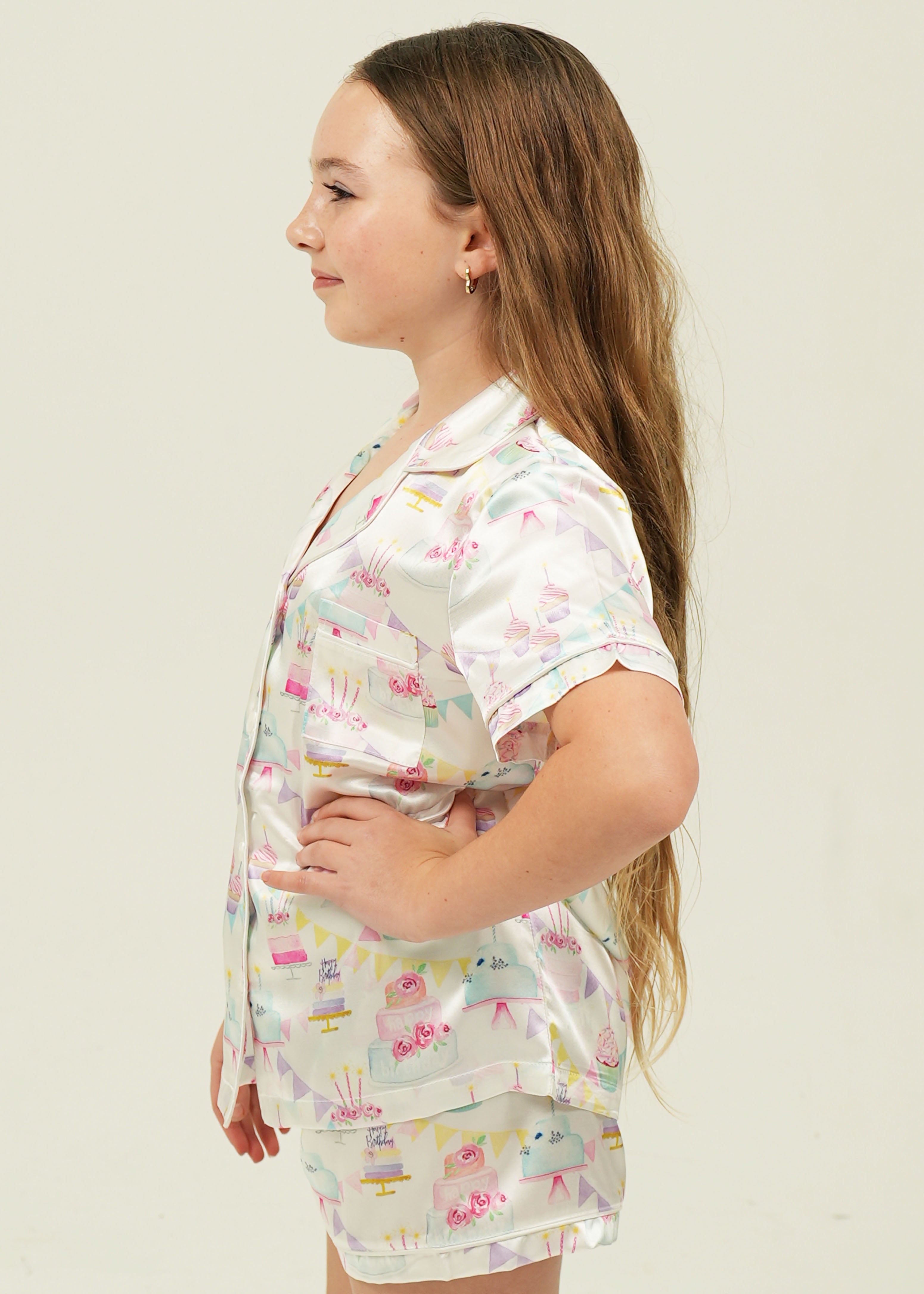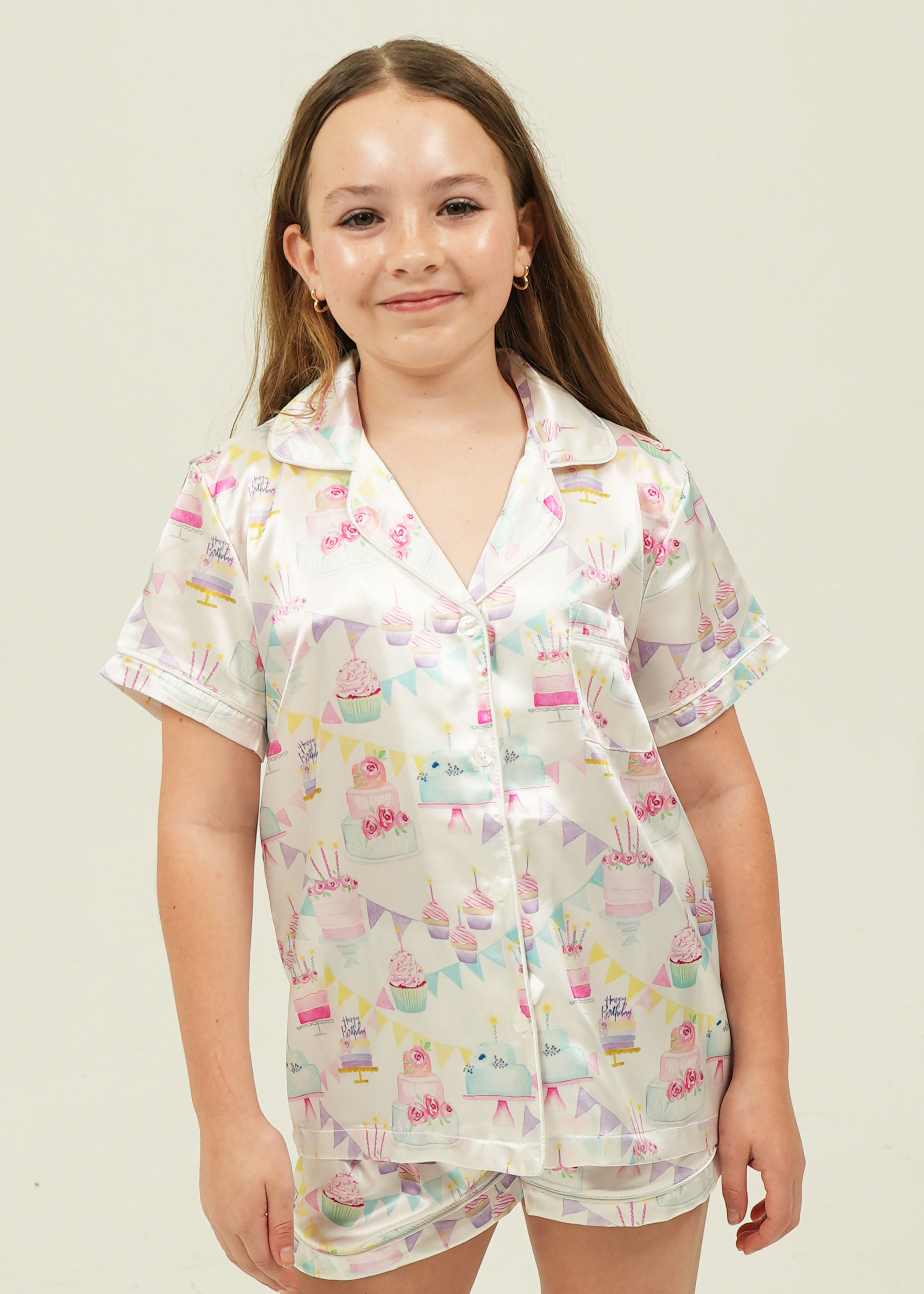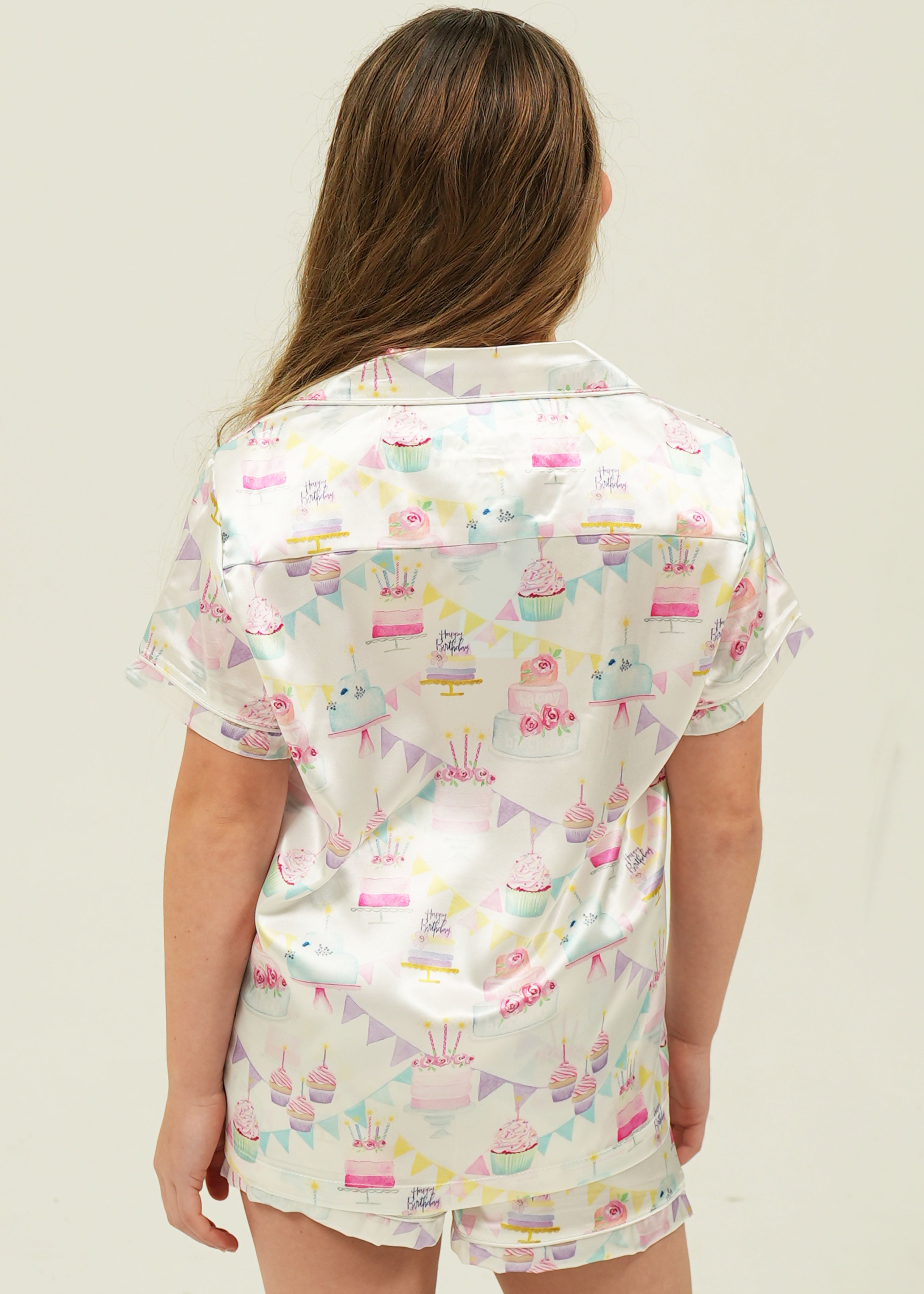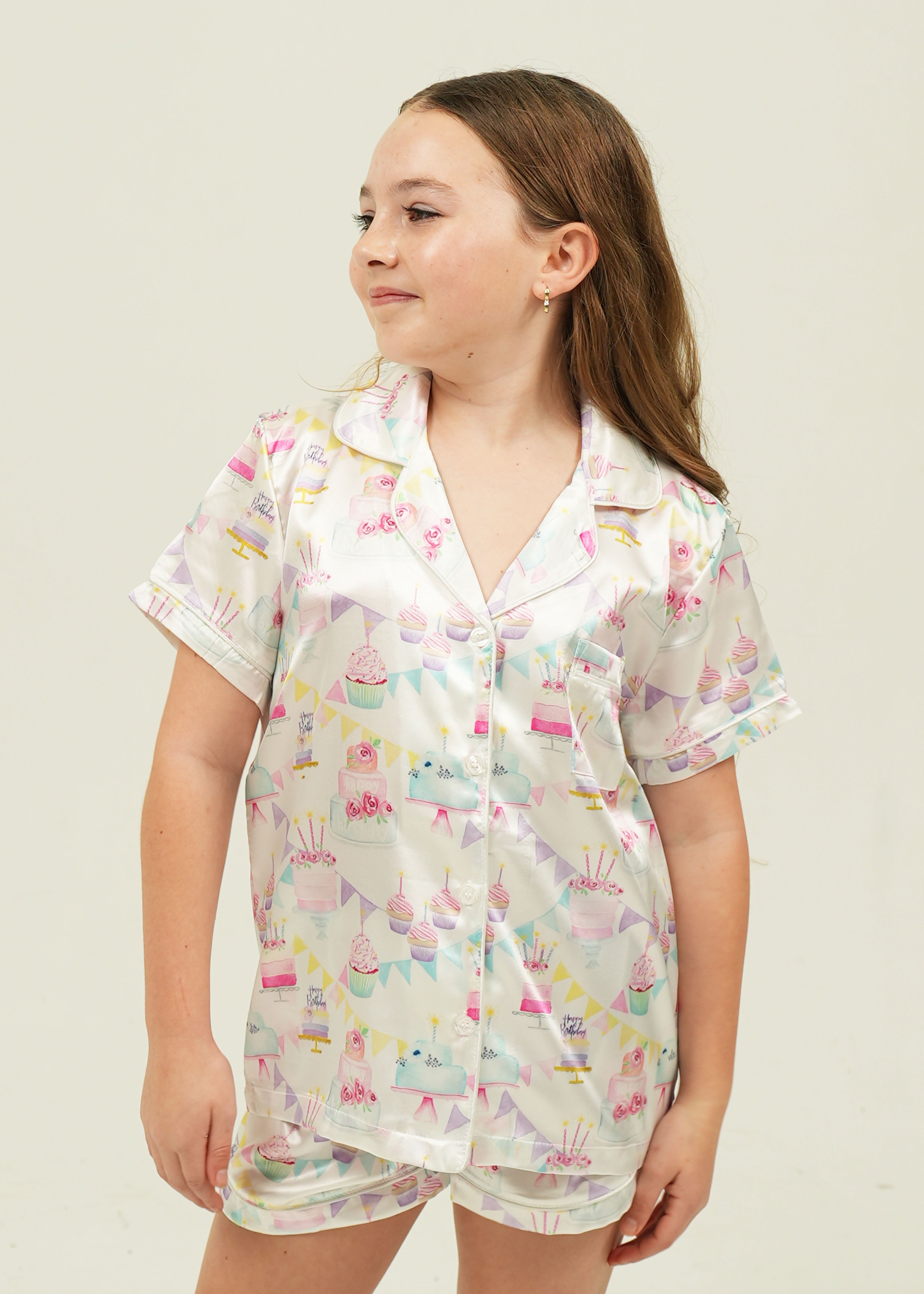 Celebrate in style with our festive Satin Birthday Pajamas. Whether on your special day or just for fun, our Birthday set will make every moment a little brighter. Lovingly detailed with deep pockets, adorable buttons, and an extra stretchy elastic waistband for the ultimate comfort experience.