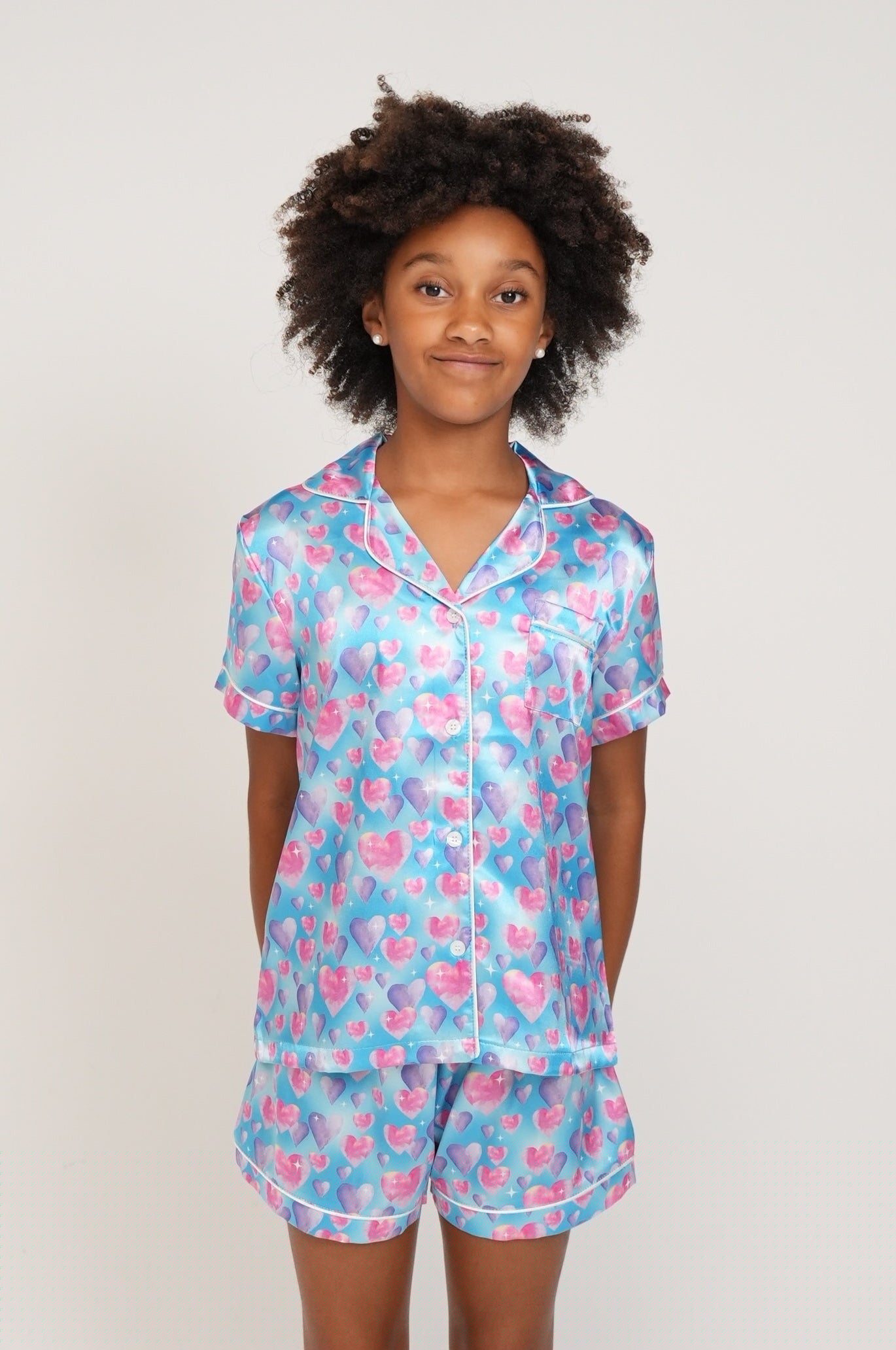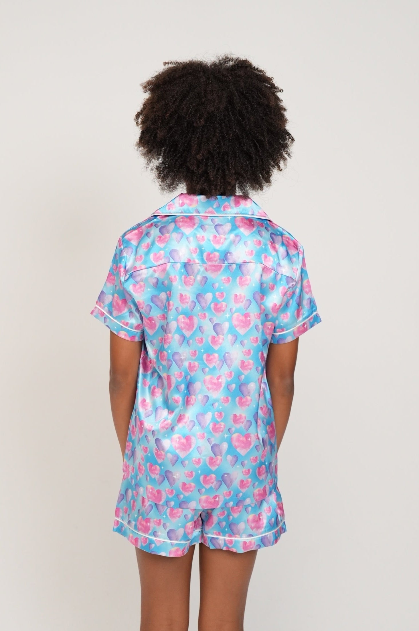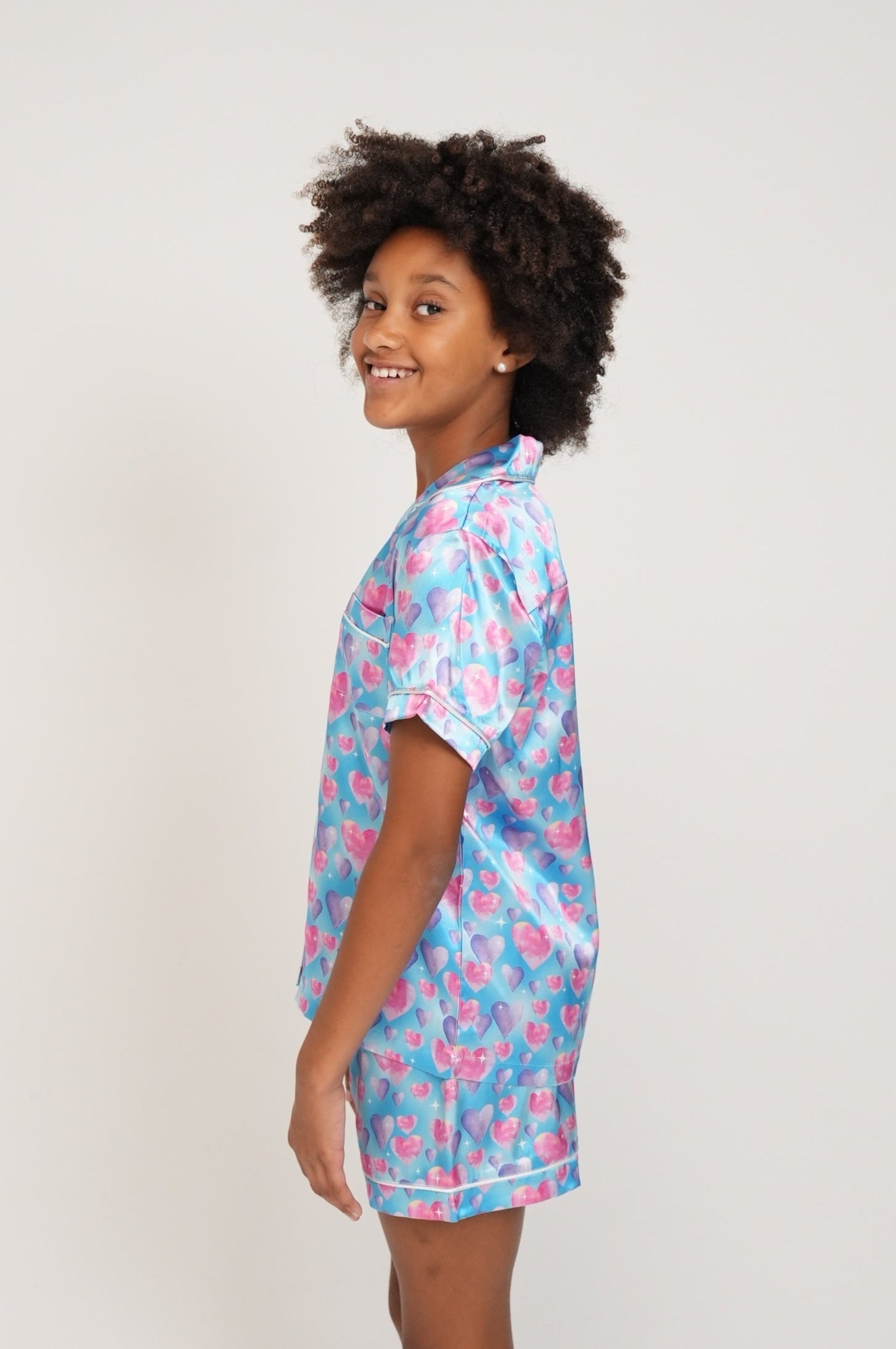 Girls - Diamond Hearts Blue Satin Short PJ Set