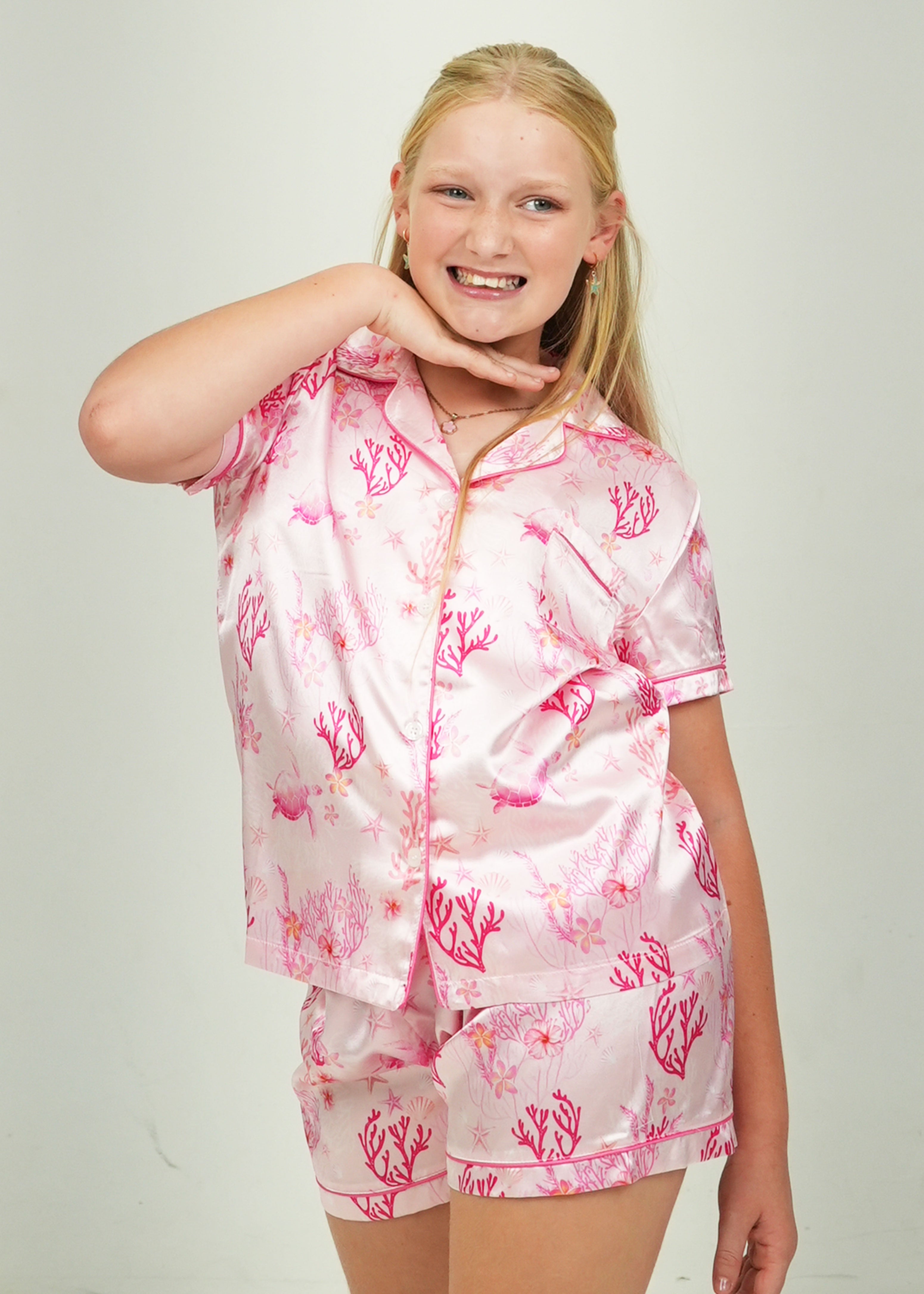 Girls - Pink Coral Garden Satin Short PJ Set