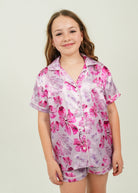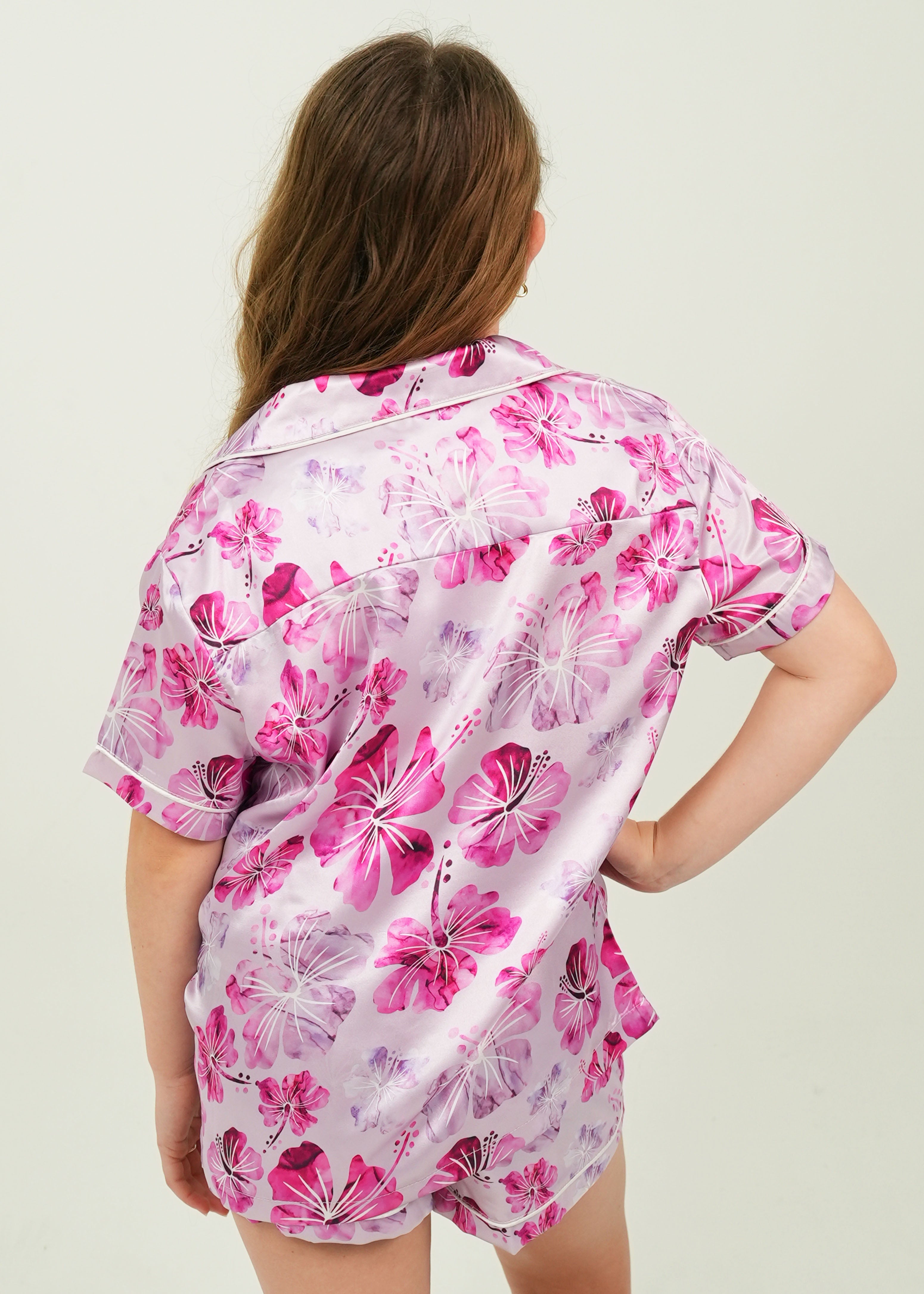Embrace your inner tropical queen with these gorgeous Pink Hibiscus Satin Pajamas. With adorable buttons, and an extra stretchy drawstring waistband for the ultimate comfort experience, you are sure to have the most tranquil sleep.