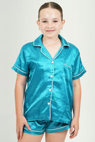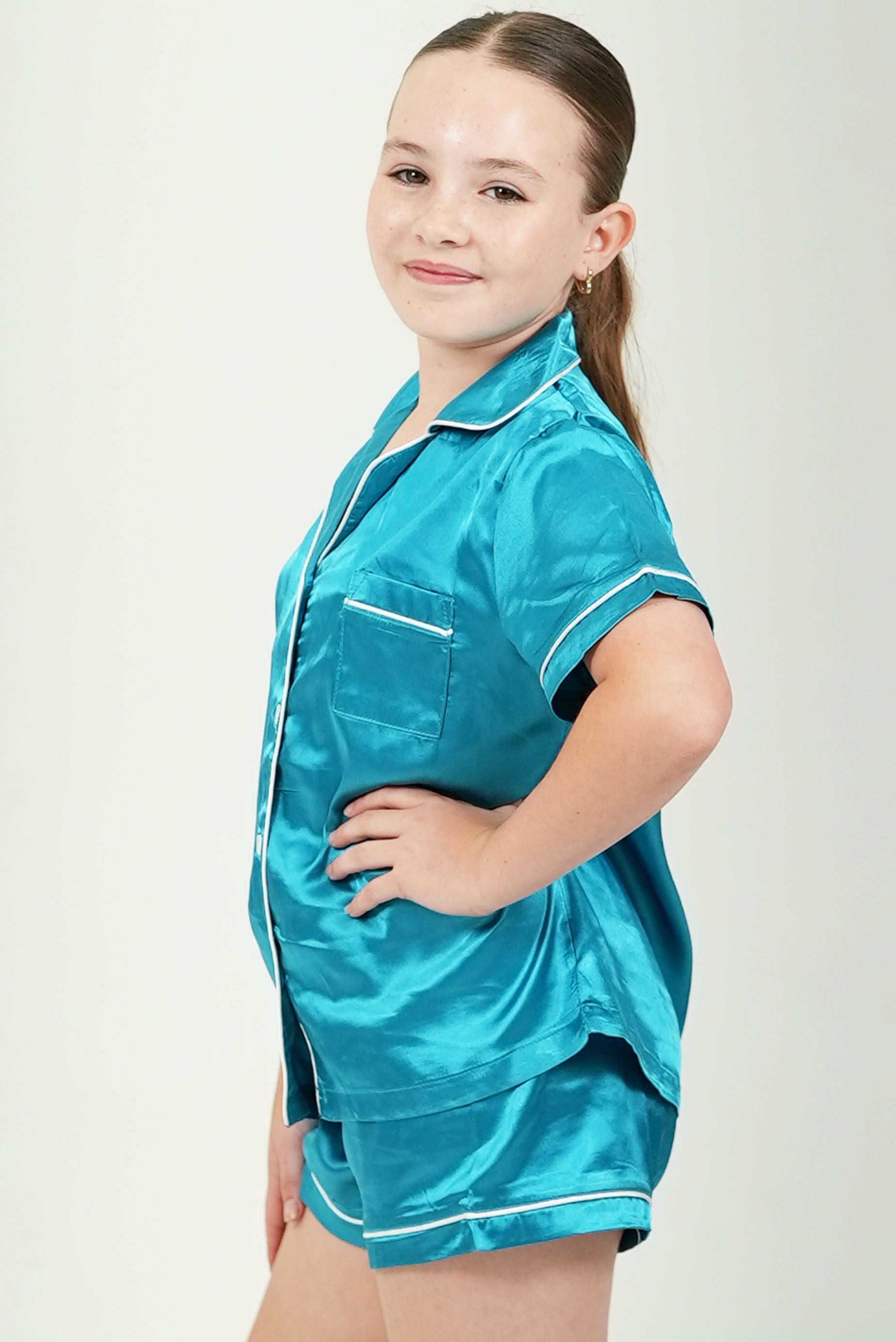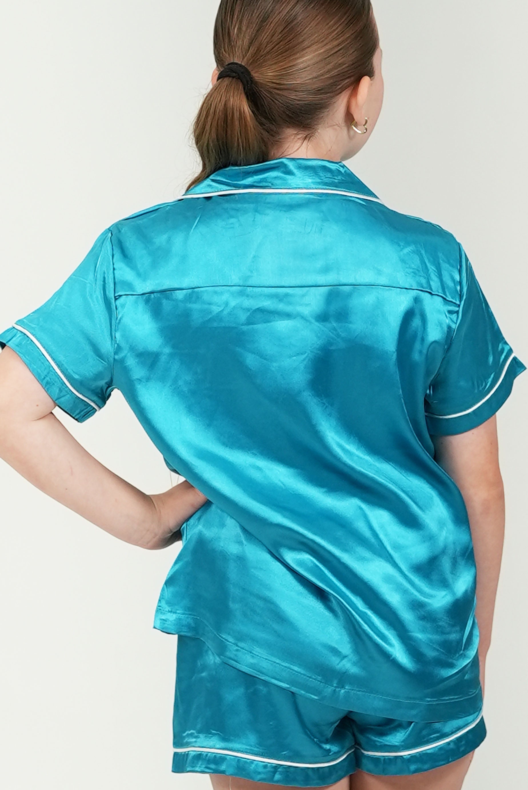 Indulge yourself in our luxuriously silky and oh so buttery soft Turquoise Satin Pajamas. Lovingly detailed with deep pockets, adorable buttons, and an extra stretchy drawstring waistband for the ultimate comfort experience.