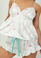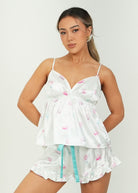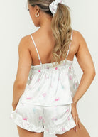 Add a touch of goodness to your bedtime with our gorgeous White Turtles Satin Camisole Pajamas. Fashioned with the cutest frill detailed shorts, adjustable straps and flattering neckline, you are sure to have the sweetest sleep!