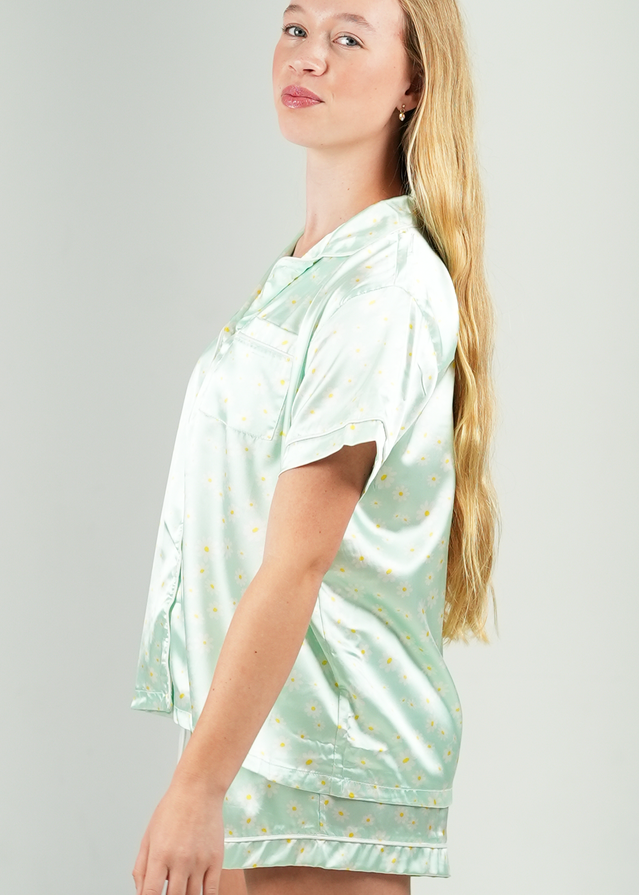 Frolic through the fields of endless daisies in our Green Daisy Short Satin Pajamas. With deep pockets, adorable buttons, and an extra stretchy waistband for the ultimate comfort experience, you are sure to have the most luxurious sleep.