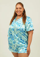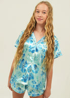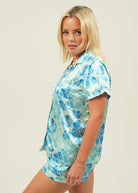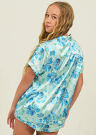 Embrace your inner tropical queen with these gorgeous Aqua Hibiscus Satin Pajamas. With deep pockets, adorable buttons, and an extra stretchy drawstring waistband for the ultimate comfort experience, you are sure to have the most tranquil sleep.