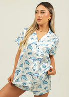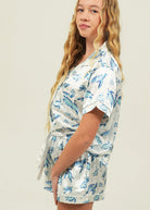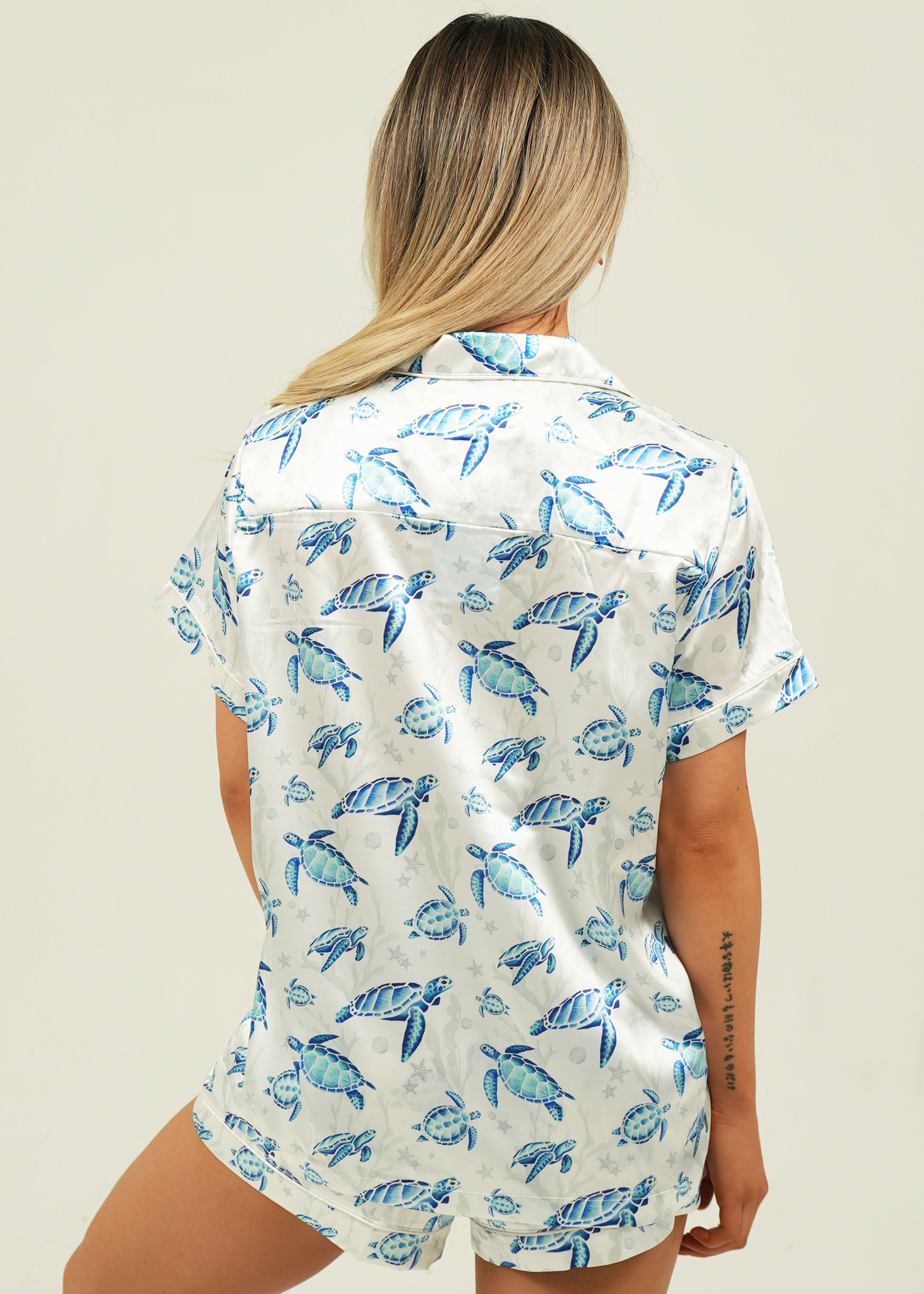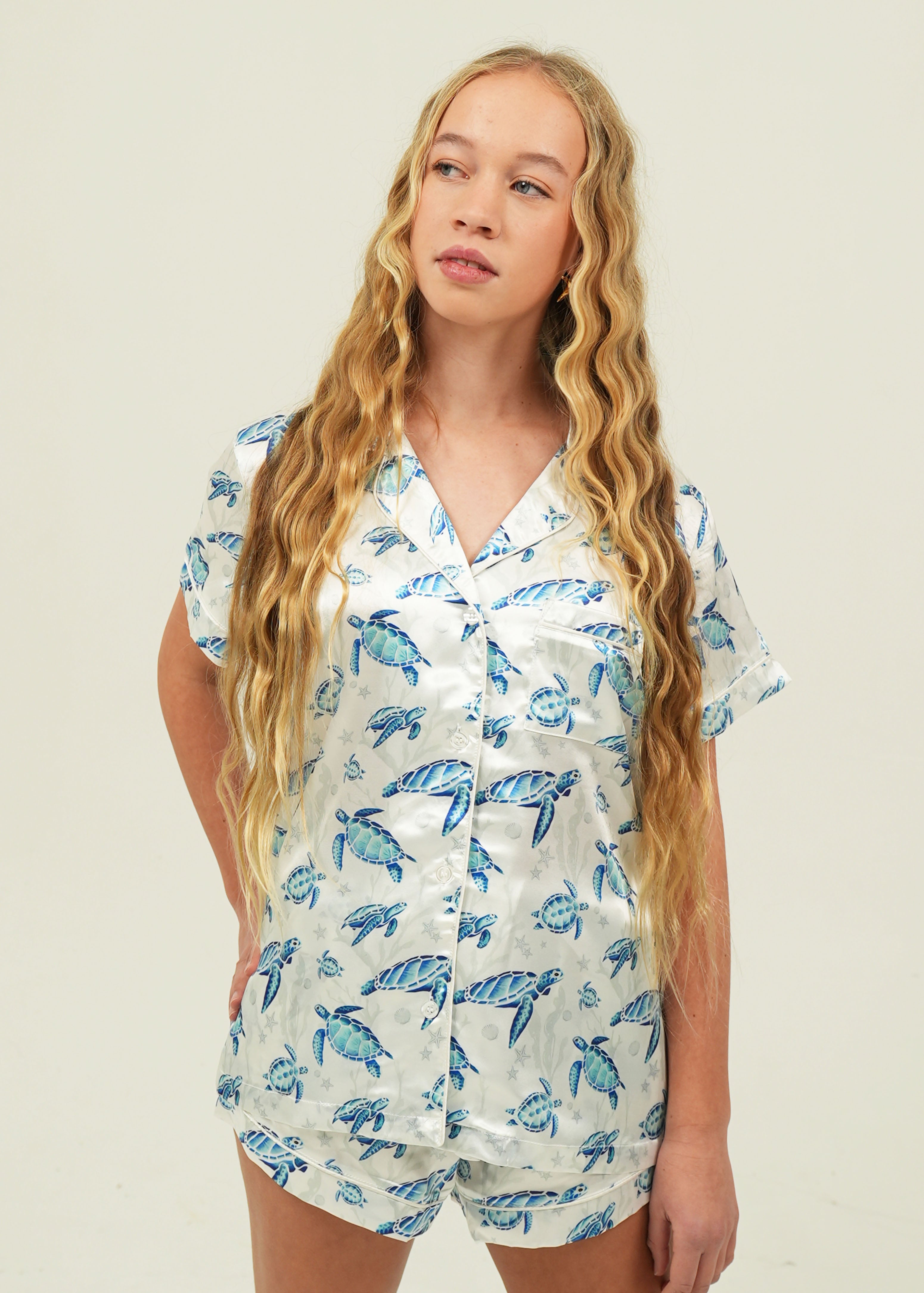 Swim with the turtles from the comfort of your very own bed with the stunning Find the Current Satin Pajamas. Crafted with deep pockets, a stretchy drawstring waistband, and buttery soft fabric, you are sure to have the most luxurious sleep.