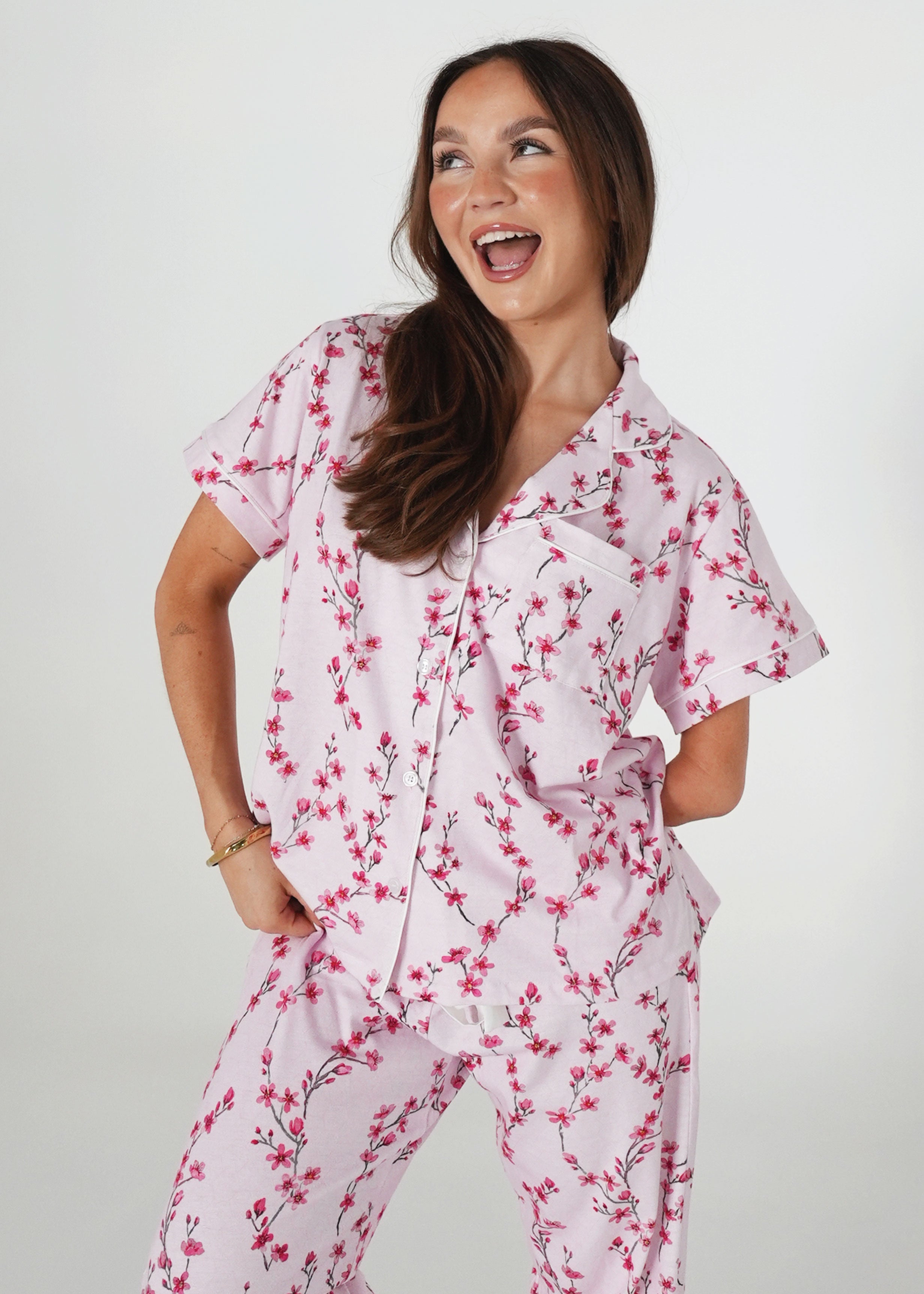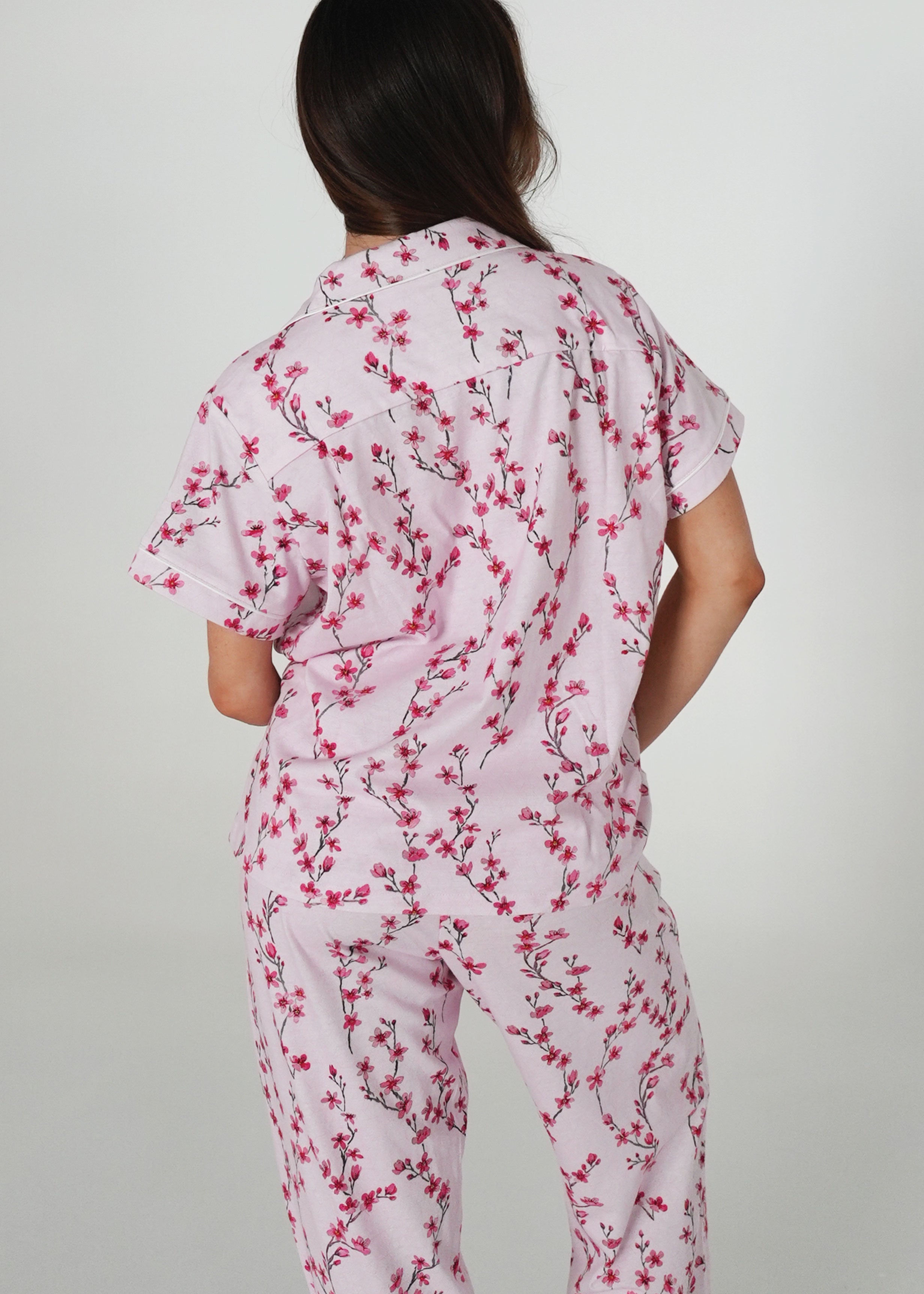 Cherry Blossom Jersey Knit Cotton Short Top / Long Pants PJ Set