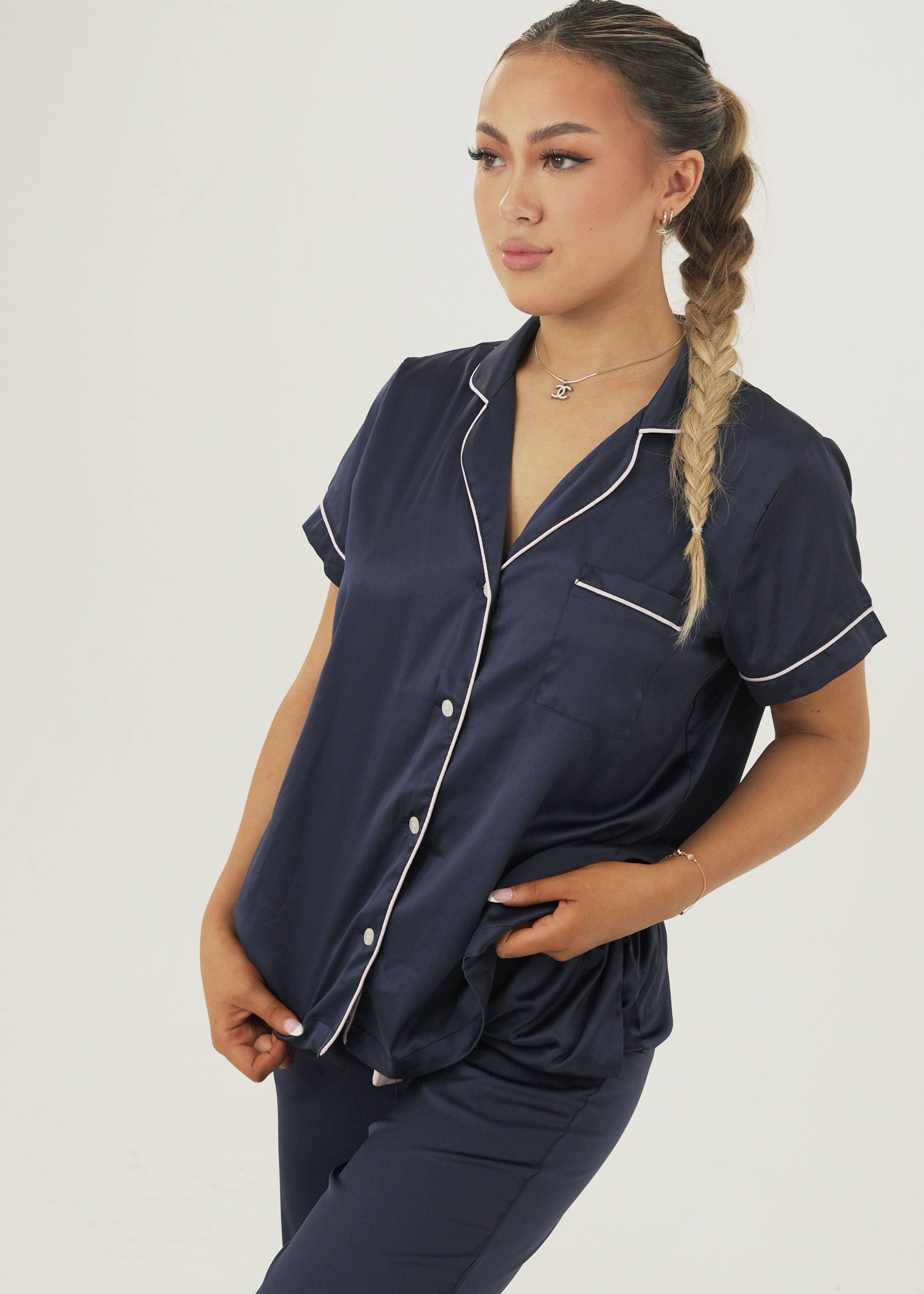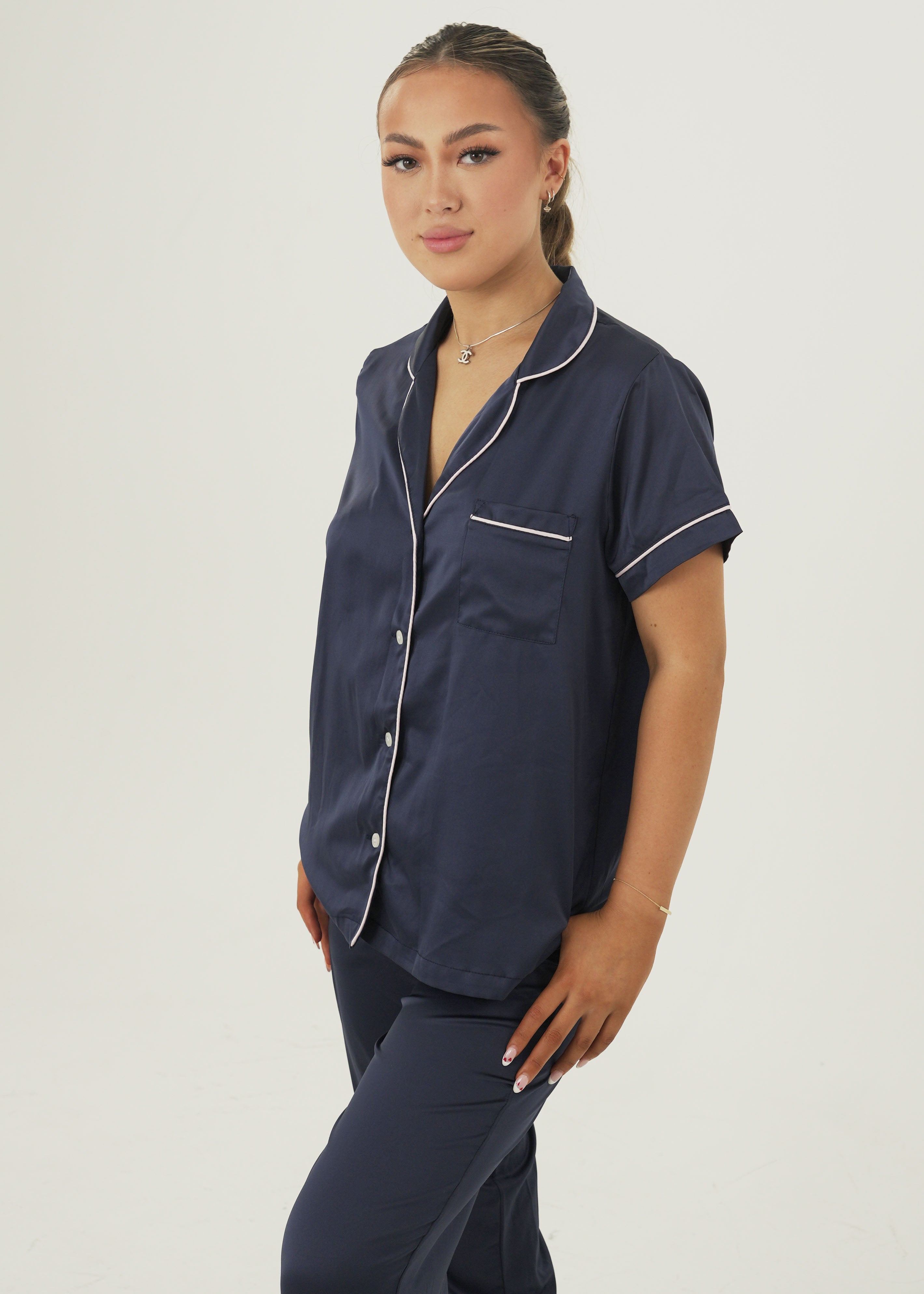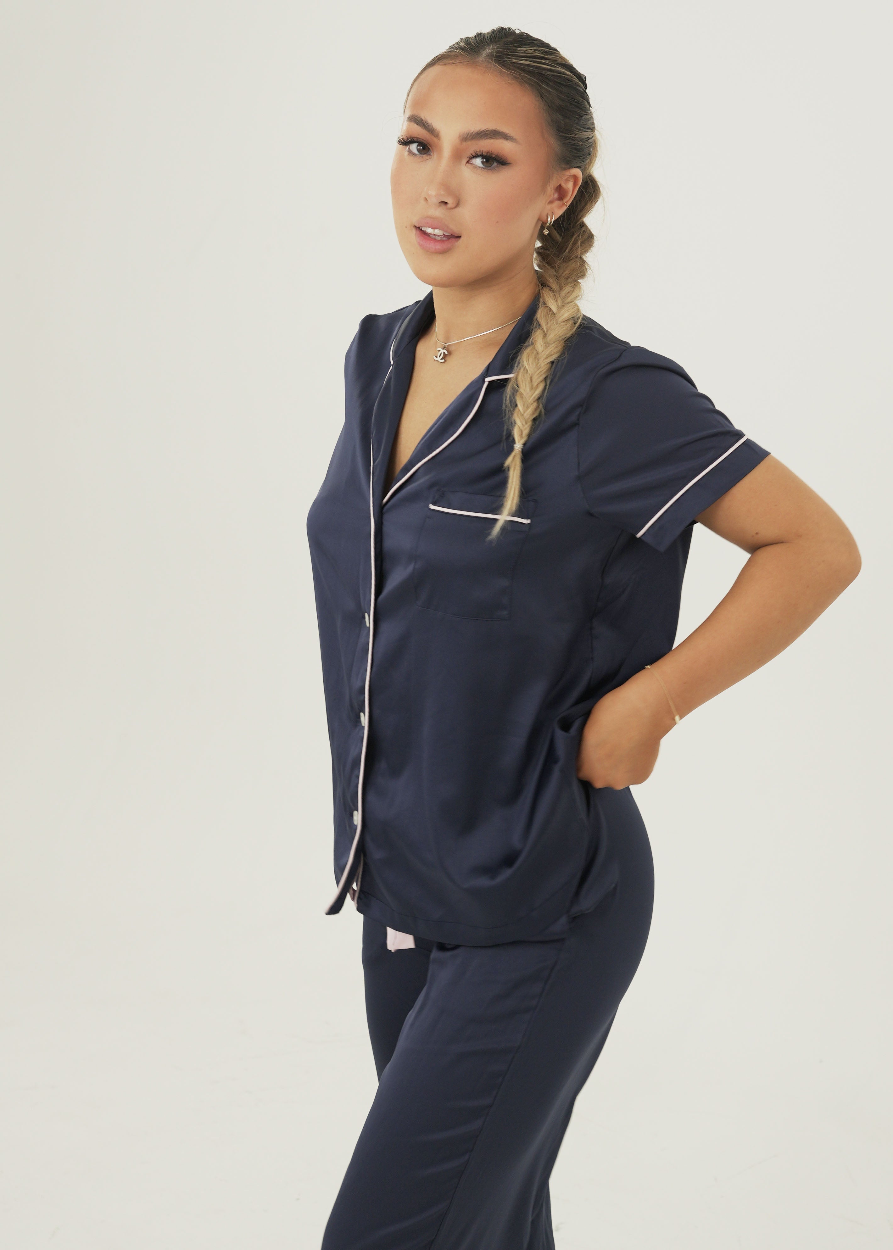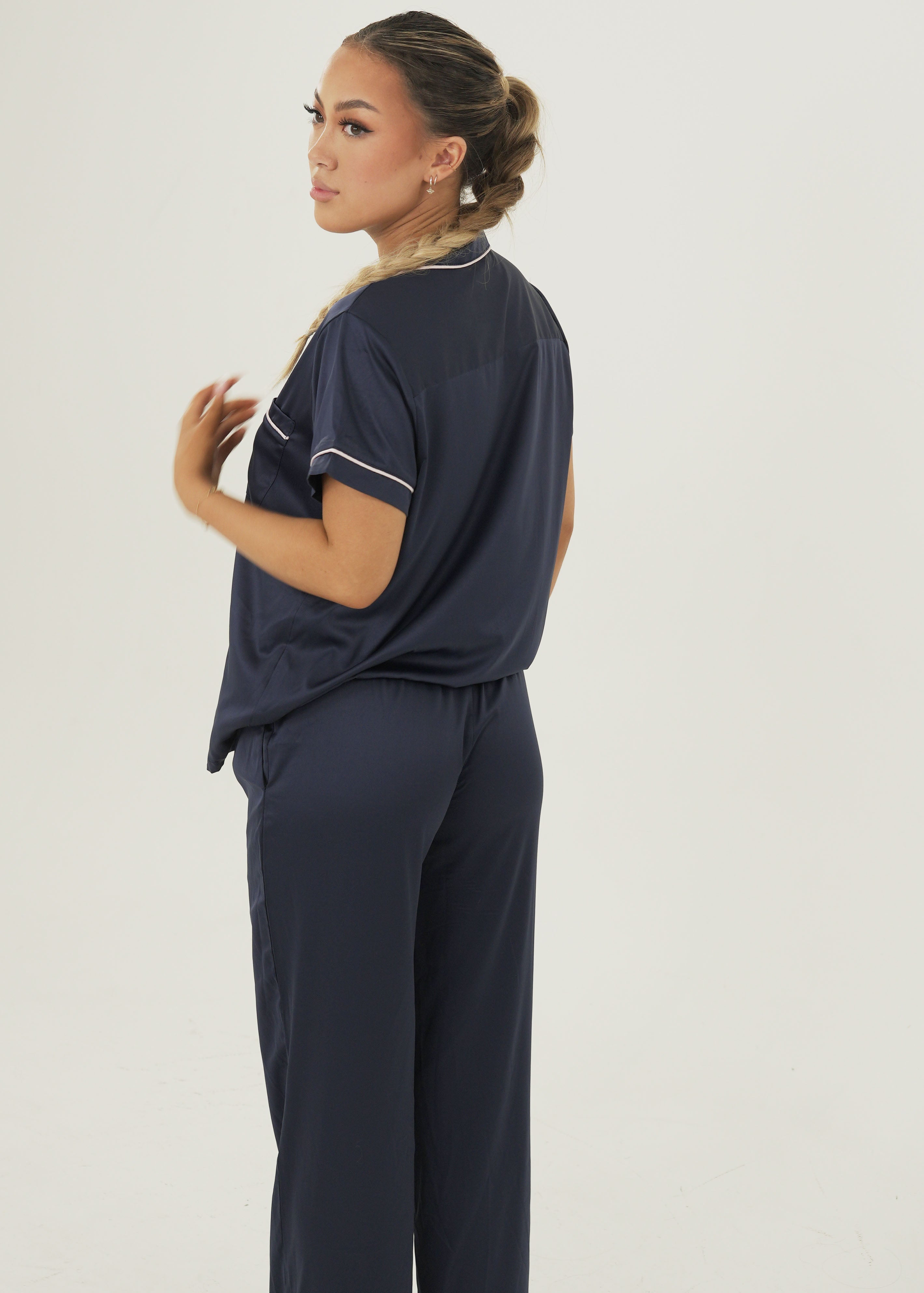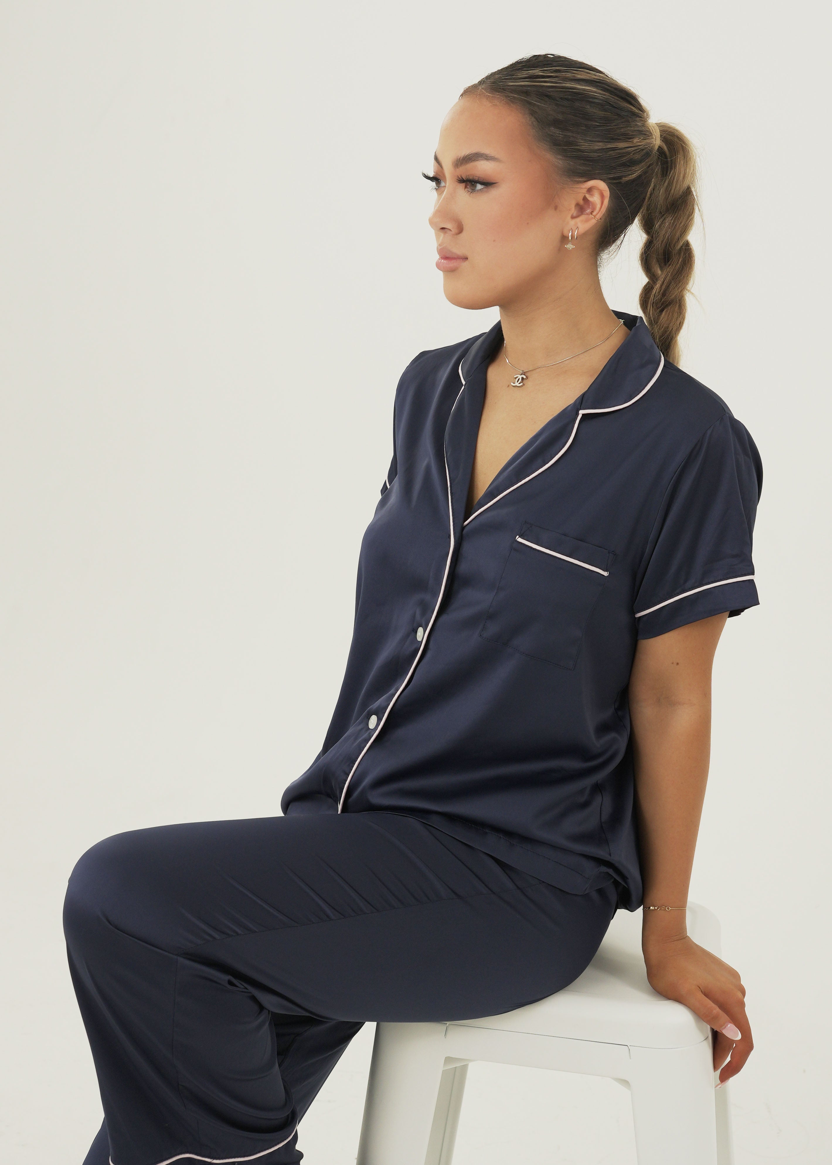 Indulge yourself in our luxuriously silky and oh so buttery soft Navy Matte Satin Pajamas. Lovingly detailed with deep pockets, adorable buttons, and an extra stretchy drawstring waistband for the ultimate comfort experience.