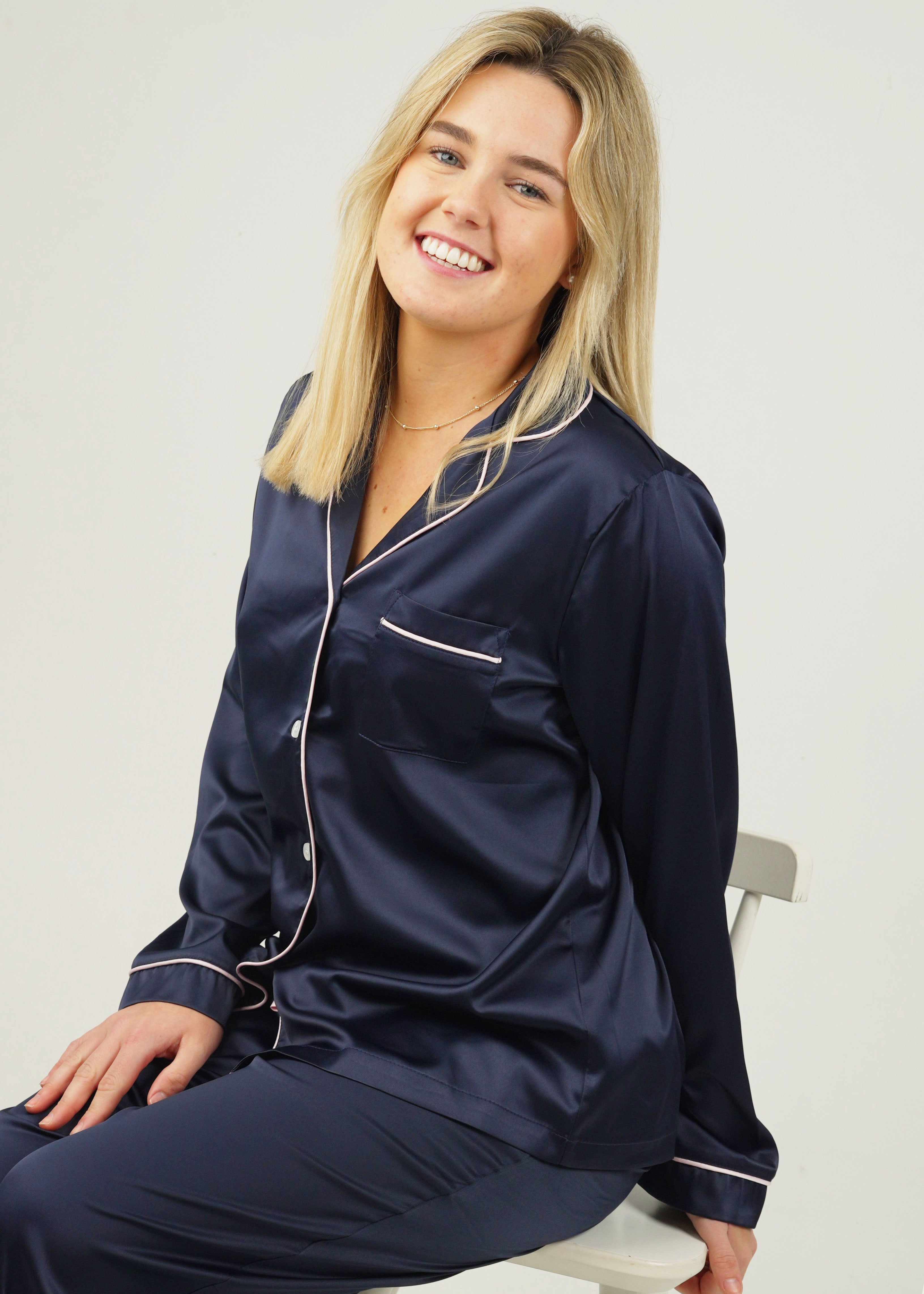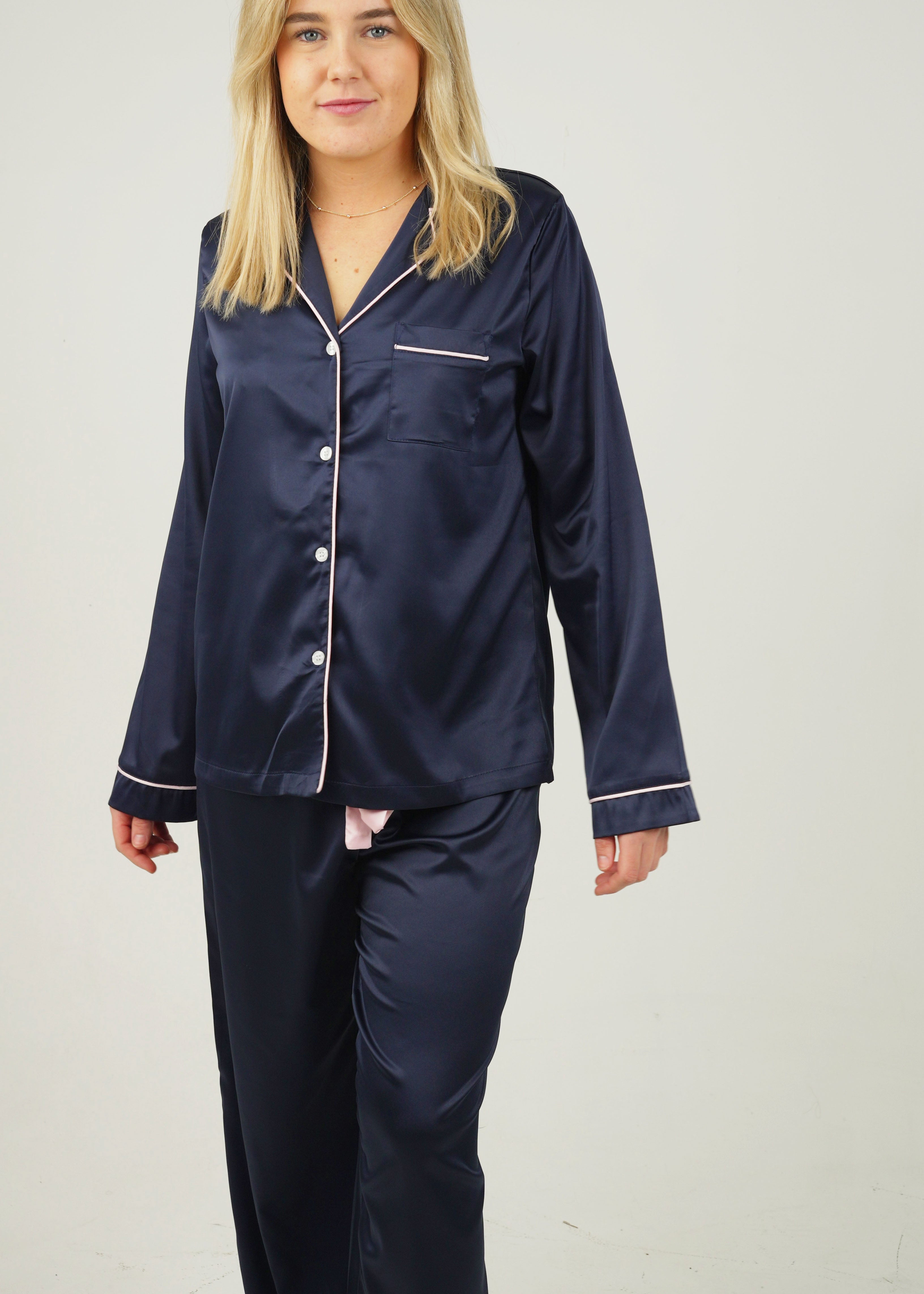 Indulge yourself in our luxuriously silky and oh so buttery soft Navy Matte Satin Pajamas. Lovingly detailed with deep pockets, adorable buttons, and an extra stretchy drawstring waistband for the ultimate comfort experience.