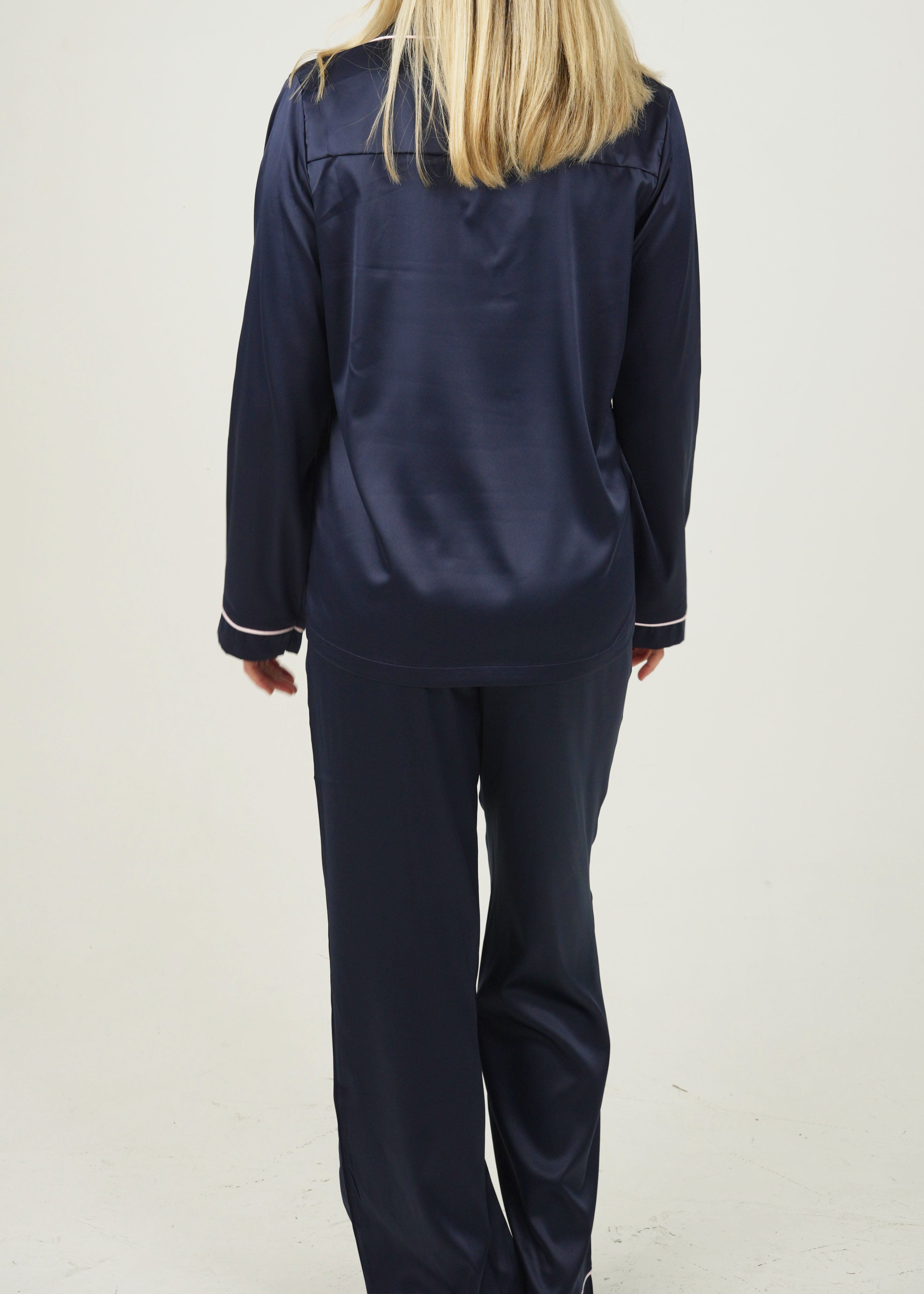 Womens Navy Blue Matte Satin Long Pajama Set