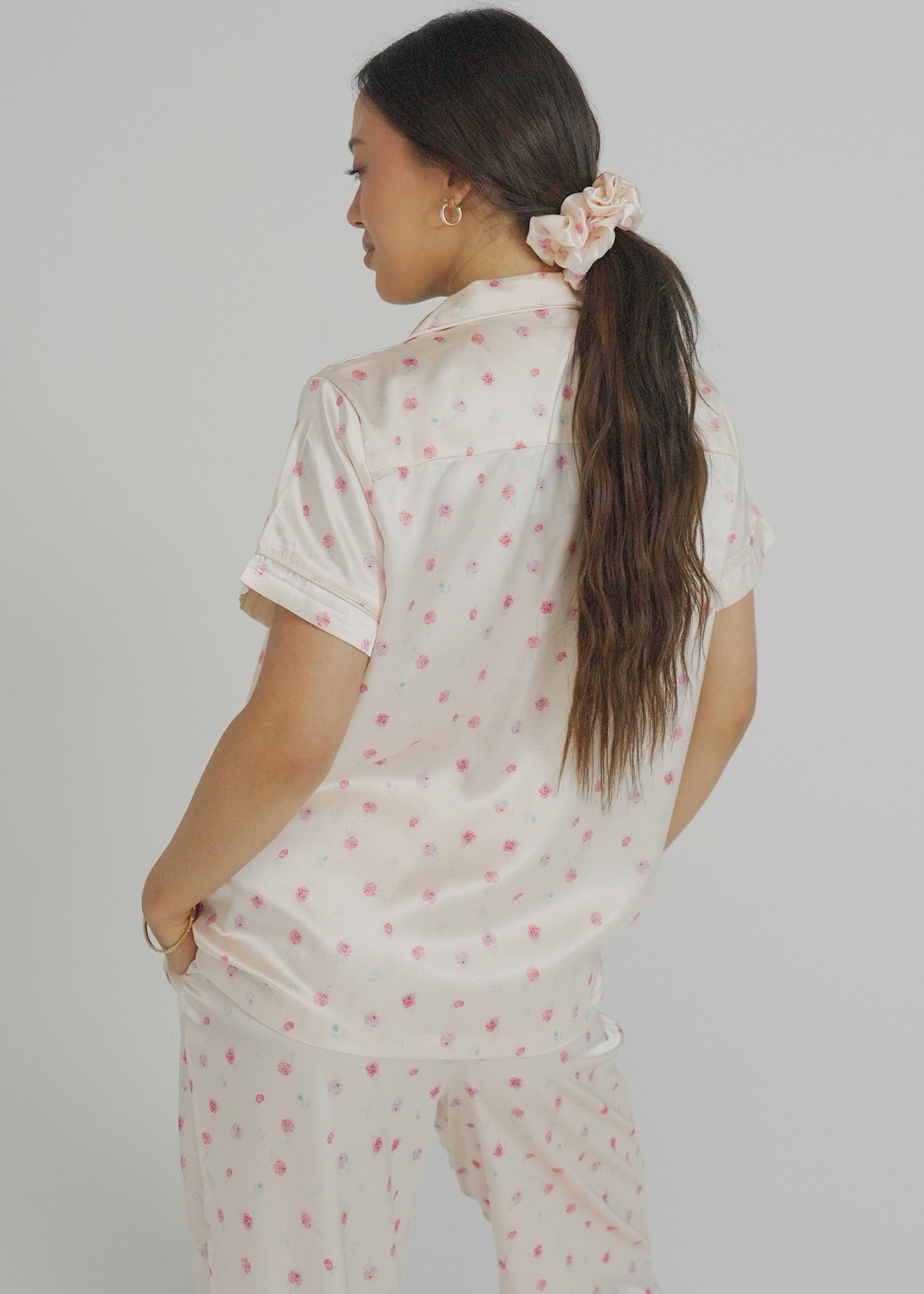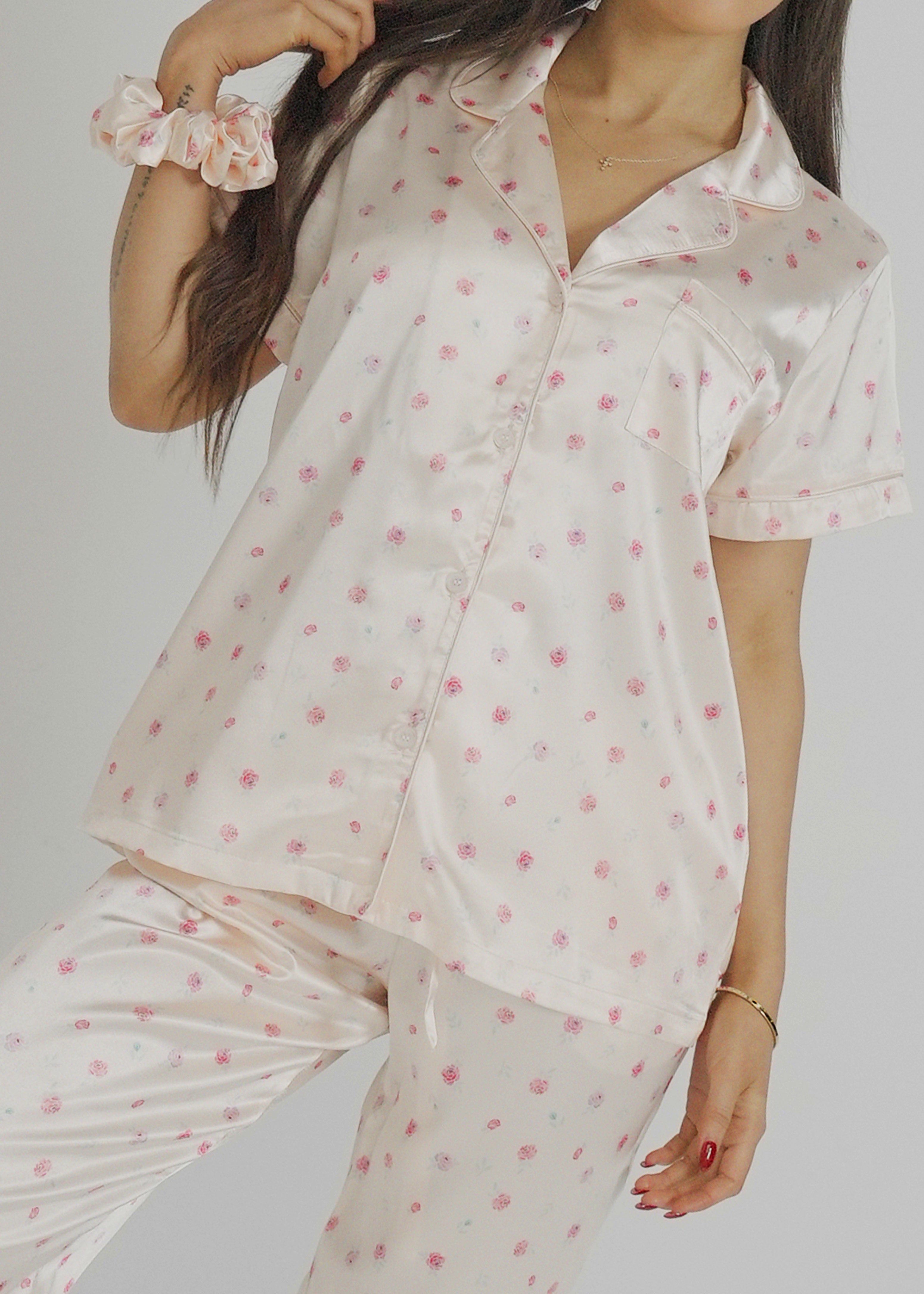 Add a touch of nostalgia to your bedtime with these gorgeous Champagne Rose Satin Pjs. With deep pockets, adorable buttons, and an extra stretchy drawstring waistband for the ultimate comfort experience, you are sure to have the most tranquil sleep.